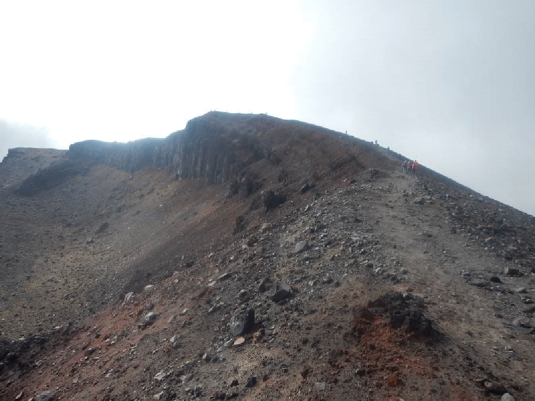 帰りではもちろん草すべりの300mの登りが待っていた。浅間山荘から入るのが一般的だと後から知った。なるほど!この草すべりがあるからか。ゼイゼイ言いながら第1外輪に着くと、そこにも登山者があふれていた。トーミの頭や黒斑山など第1外輪は浅間山の絶好の展望台となっている。今回はガスで残念。