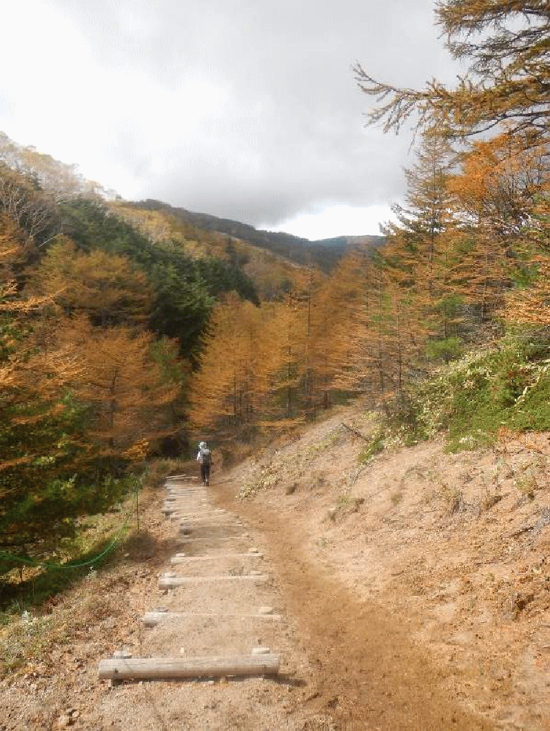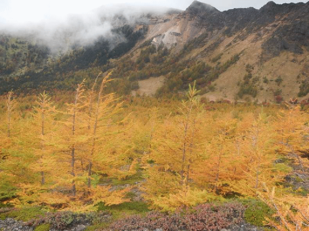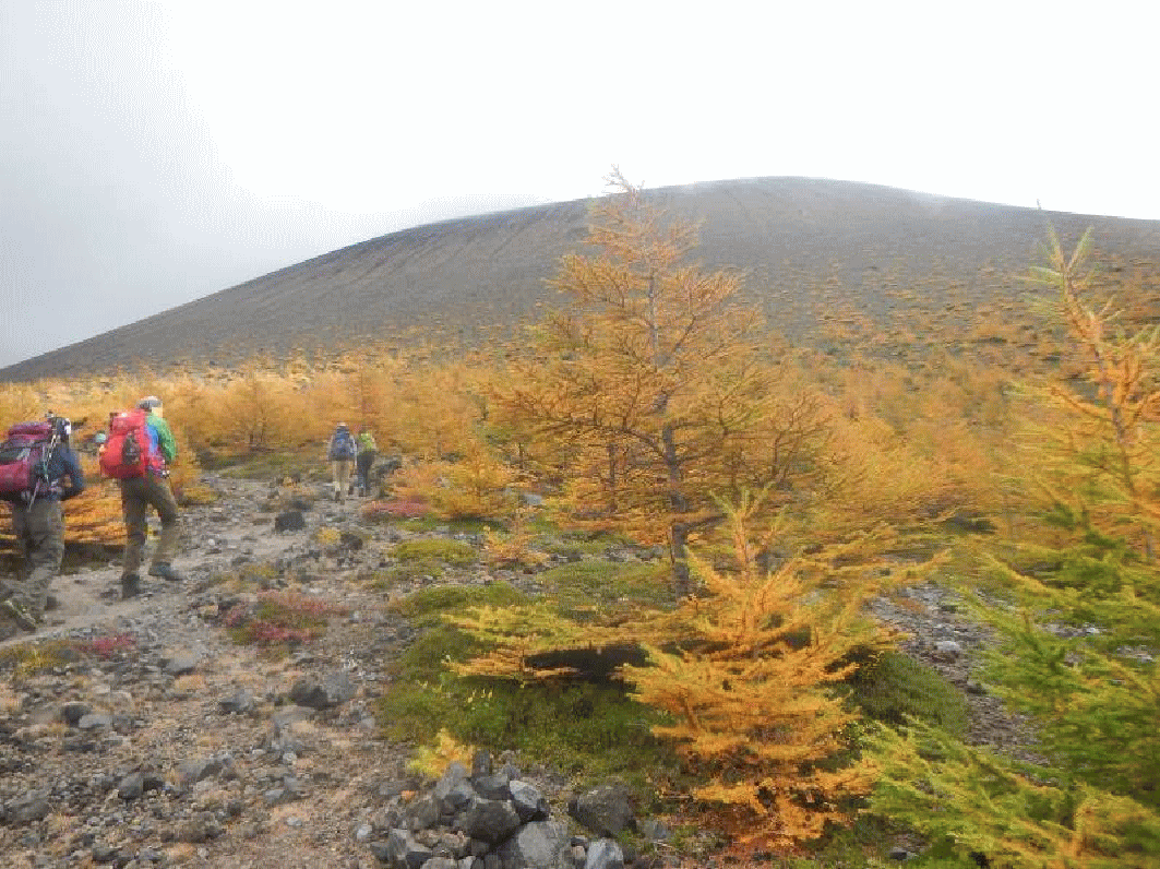 湯ノ平口から賽の河原に向けて黄葉したカラマツの木々の間を行く。山頂付近はガスの中。登山道は徐々に傾斜を増し、シェルター手前で方角を変え、第2外輪上を行く。台風の影響か、風が強い。
