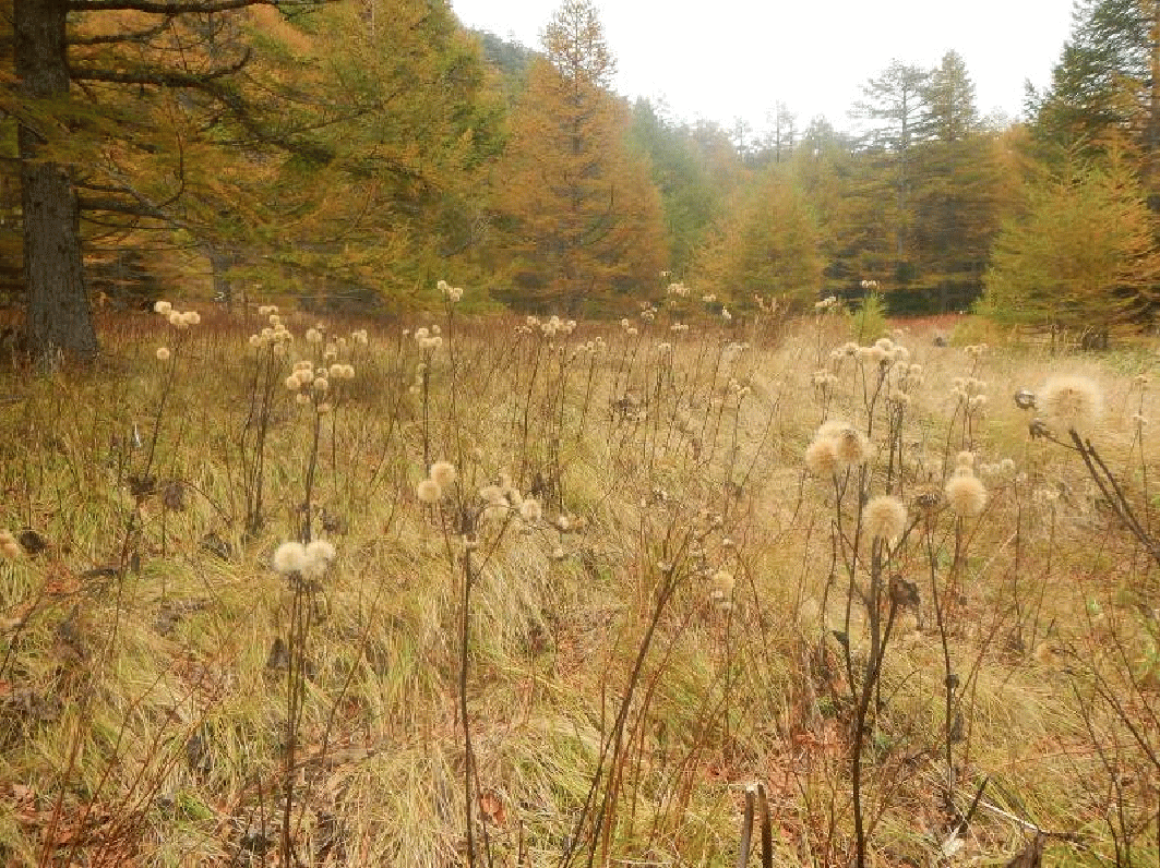 トーミの頭まで樹林帯の中の道。トーミの頭からすぐの黒斑山への分岐で道は分かれ、すさまじい勢いで急斜面を下りていく。草すべりといわれる標高差300mの激下りだった。下り切ったところが浅間山荘からの道と合流する湯ノ平口。針葉樹林に囲まれた小さな湿地帯で、草紅葉が美しい。
