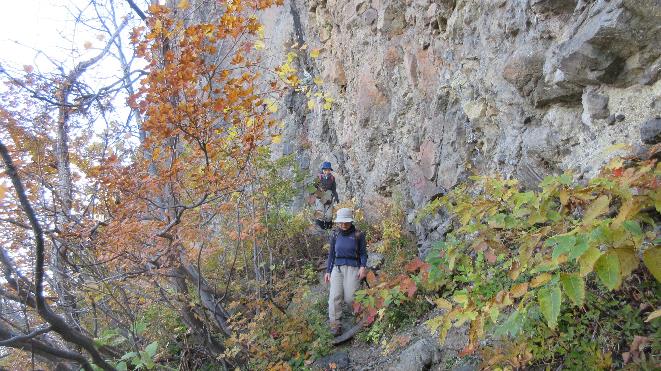 《バンドまでは紅葉の中、急な尾根を登る》