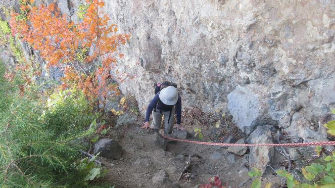 下山路は鎖とロープのある長く急な岩稜から始まる。岩質がボロボロなので落石にも注意しなければならない。