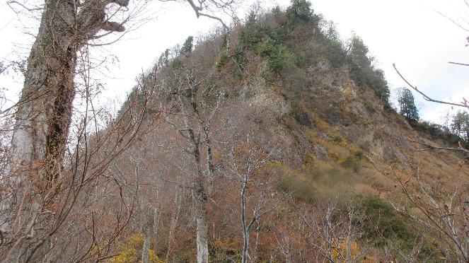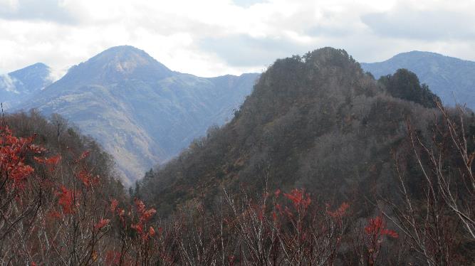 台地上のブナ林の中をしばらく行くと駒ヶ岳山頂(1487m)に着く。木々は葉を落としていて、展望は良好だ。山頂には松本からの4名パーティーが先に来ていて、悠峰と同じコースを行くとのことだった。