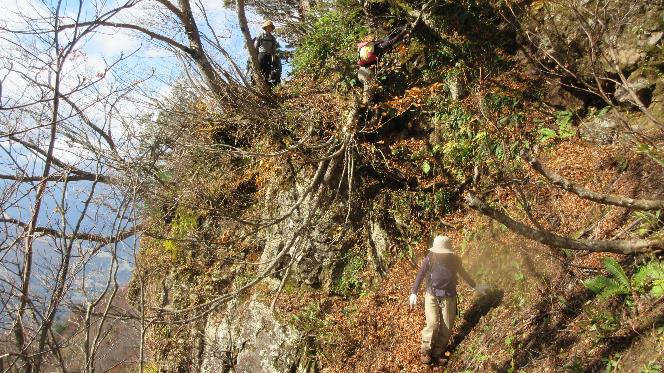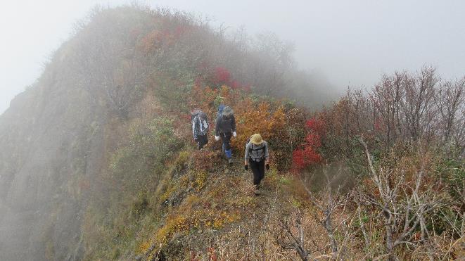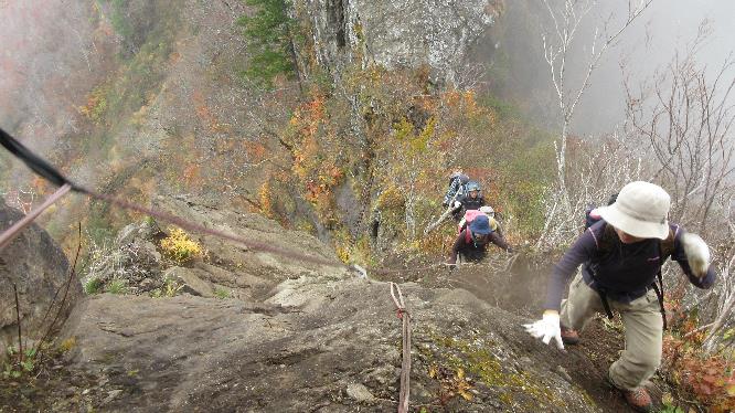 ハシゴを登り稜線に出た後はノコギリの歯を一つ一つ越えて行く。稜線上は泥壁のような所もあって滑りそうだ。いつ取り付けられたのかわからないような古いロープでも頼らざるを得ない。