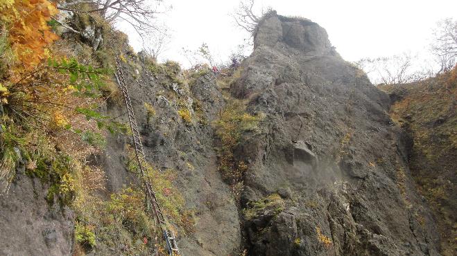 駒ヶ岳の大神堂からのルートは、正面に大岩壁が立ちはだかりとても登れそうに見えない。しかし、岩壁まで行ってみると斜上する幅広いバンド上に登山道がつけられていて転落の心配もなく簡単に歩ける。