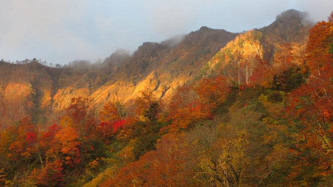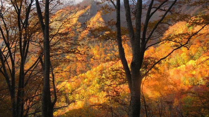 さらにおまけ。ガスが切れて雲間から差し込む光が対岸の岩壁と色づいた木々を照らした。秋の海谷ならではの光景だった。