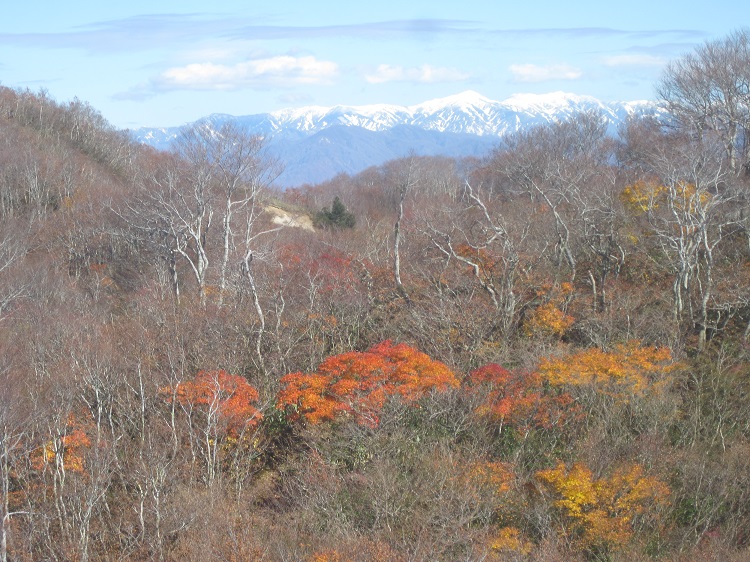 紅葉の向こうに雪の飯豊が・・・