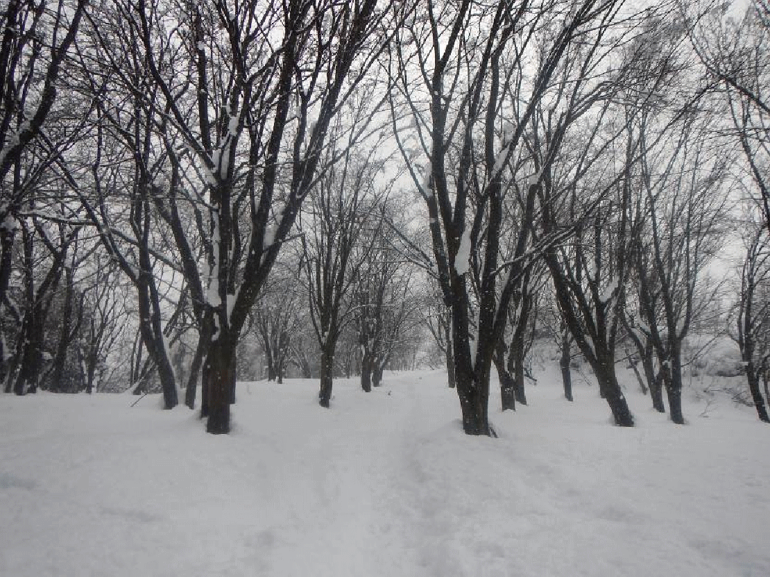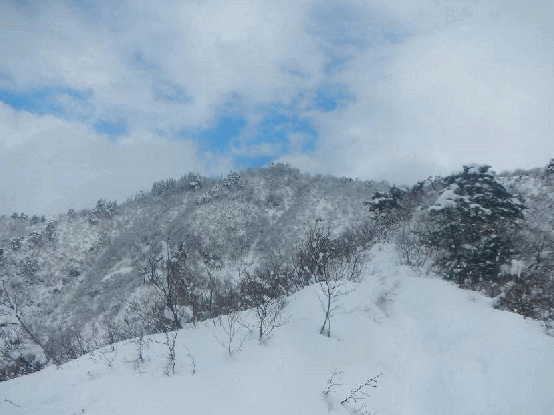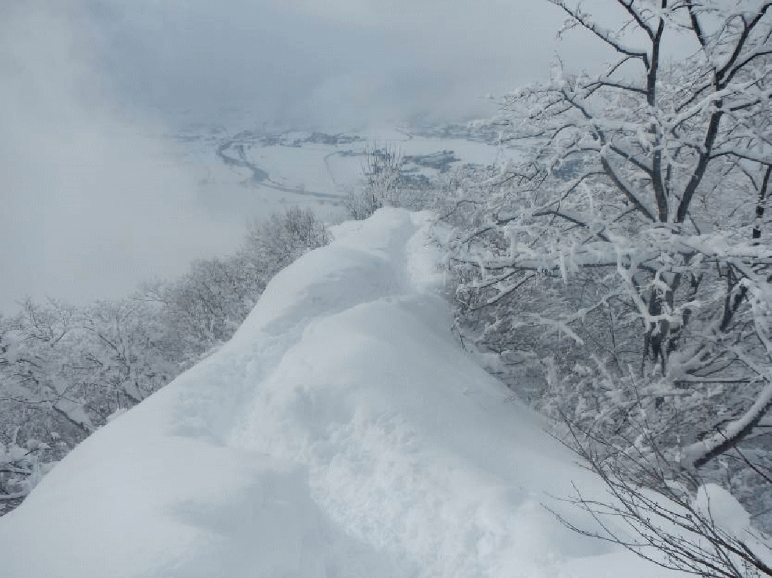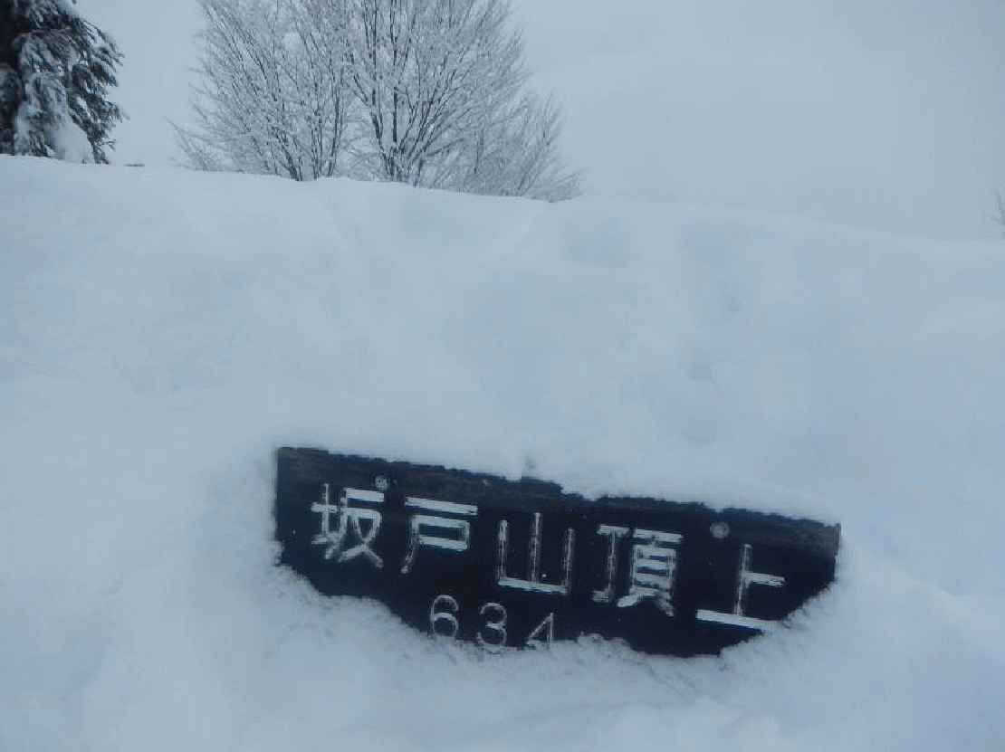 登ってみたかった雪の坂戸山。積雪期は薬師尾根コースが無難とあったので、ディスポート南魚沼の駐車場に車を止め歩き出す。集落の終わりが登山口となっていた。薬師尾根は大勢の人が登っているようでトレースはしっかりと付いているよう。ツボ足で登っていく。桜並木を抜けると尾根上の道となり、視界が開けていく。トレースは踏み固められアイゼンが必要なほどだった。