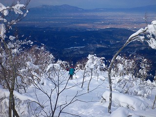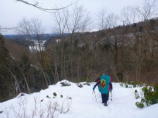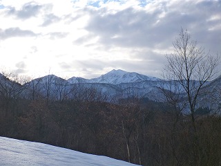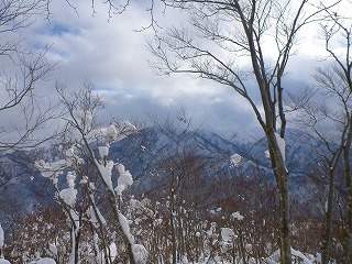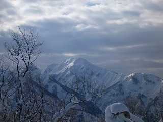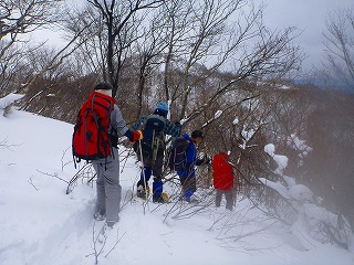しかし、ザックが重い。重すぎる。雪が少ないとはいえワカンを履いてもズブズブ埋まる。さらに夏道を外れて尾根に上がると、雪が少ないのが裏目に出て藪っぽくて歩けない。枝の上に積もった雪を踏み抜くともう大変。ヘロヘロになりながら夏道に戻ったが、宝蔵山頂に着くころにはかなり体力を消耗していた。