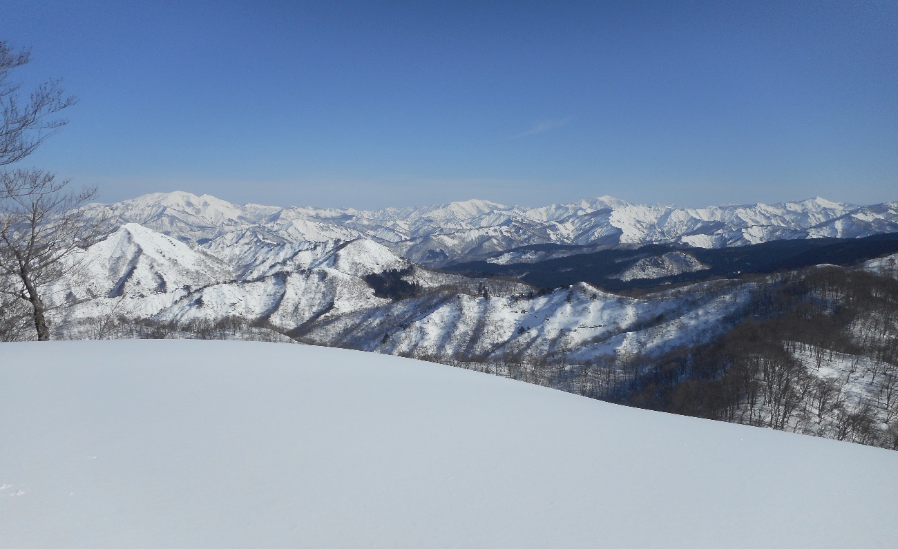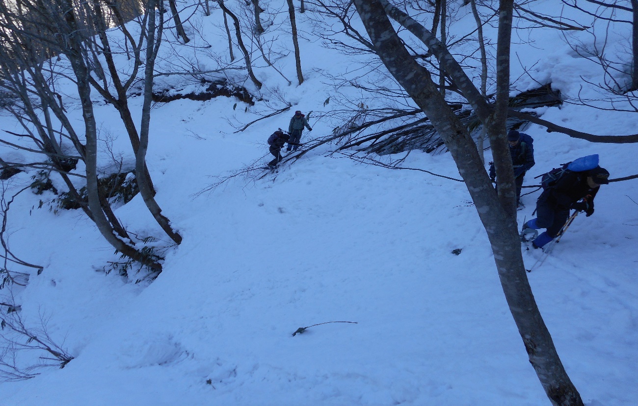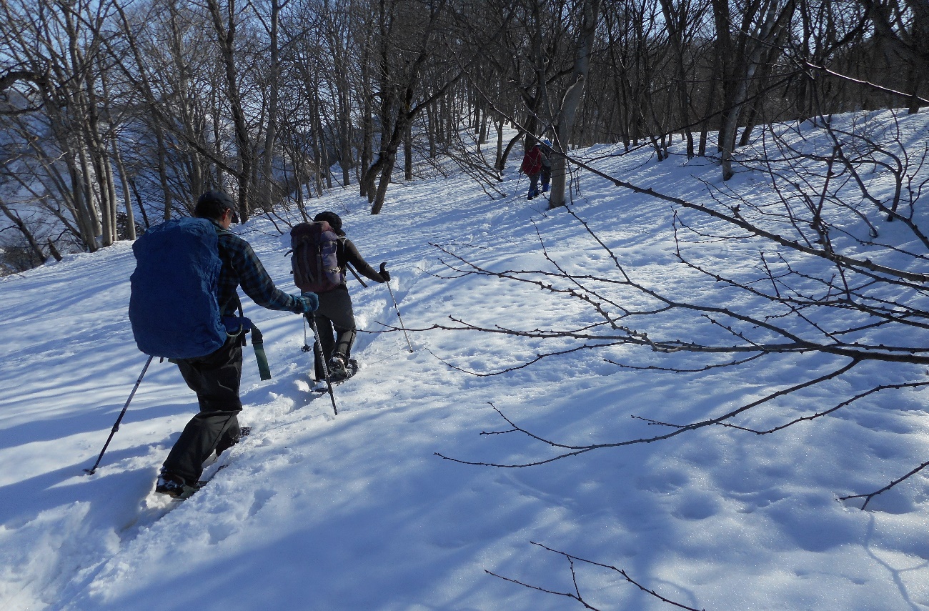 途中、森林所有者の作業道があり、しめたと思ったが倒木が結構あり、スノーシューの人は簡単にクリアーするがヤマスキーは四苦八苦で登った。