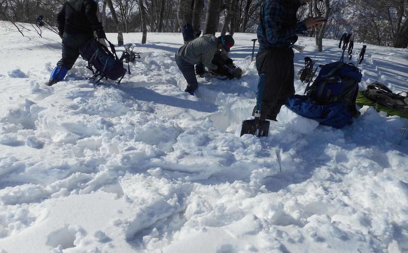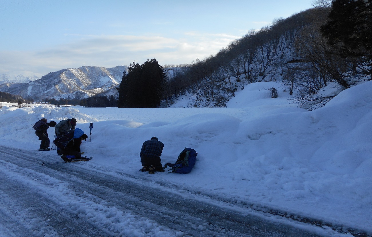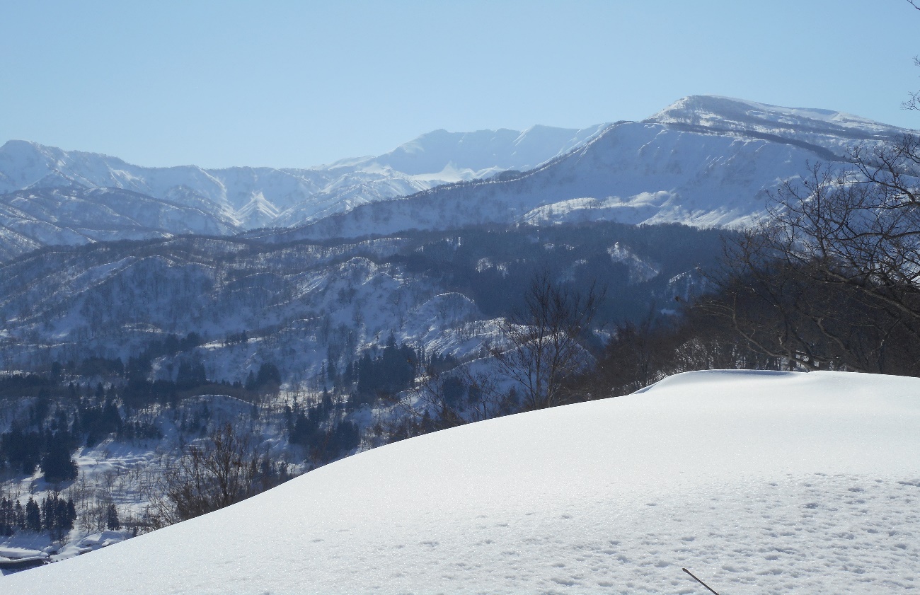 途中、森林所有者の作業道があり、しめたと思ったが倒木が結構あり、スノーシューの人は簡単にクリアーするがヤマスキーは四苦八苦で登った。