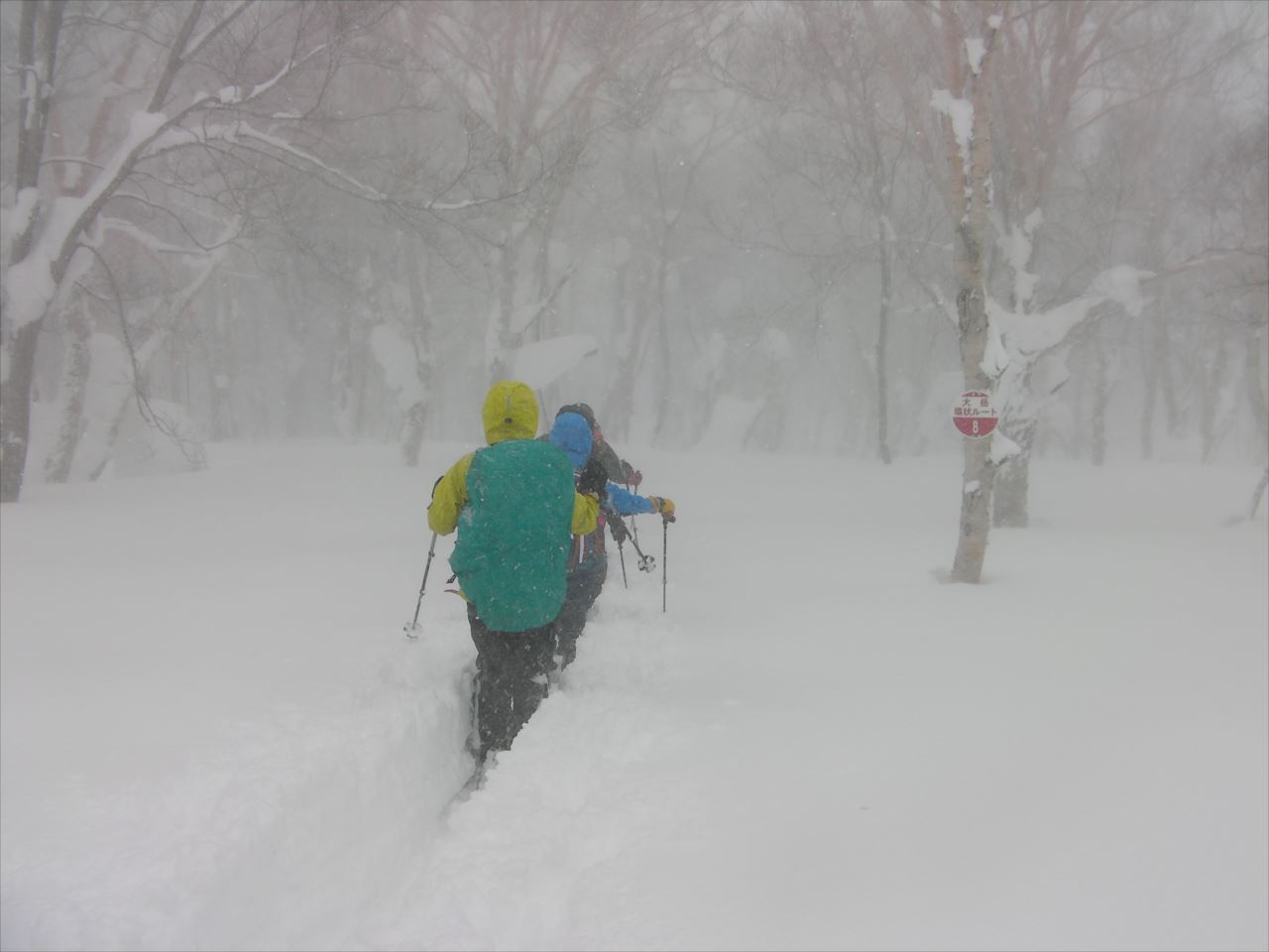 しばらく格闘すると(先頭の二人),スキールートの標識11を発見する.