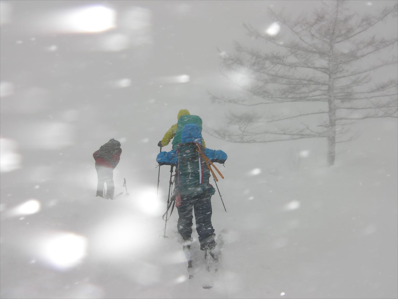 この日のために,八甲田のために発熱レンズの金輪際曇らないと評判のゴーグルを約2名が着装している.