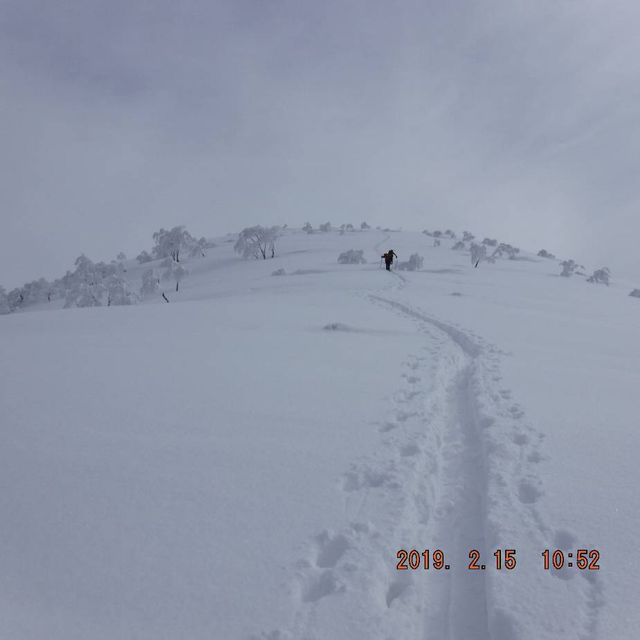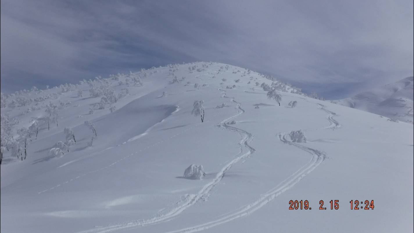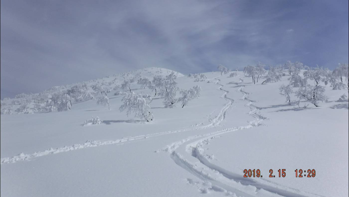 下山のスキー滑降は今シーズン一番の粉雪に恵まれ超快適な滑降が楽しめた。