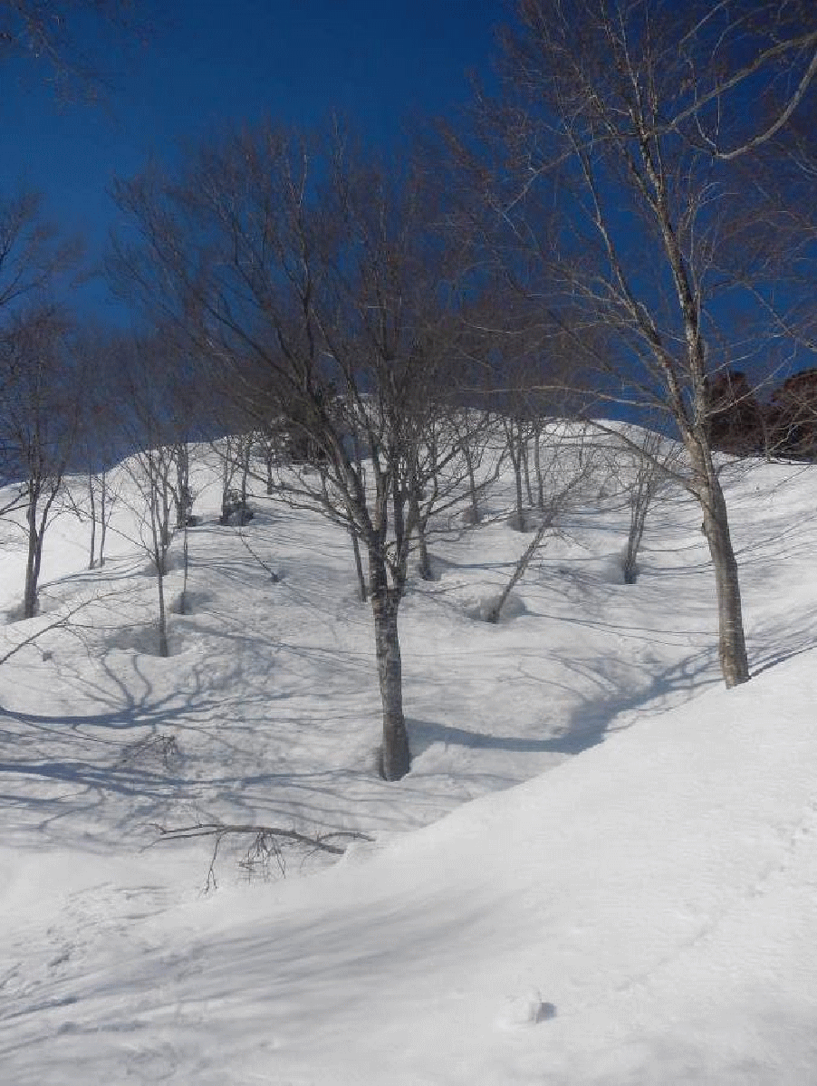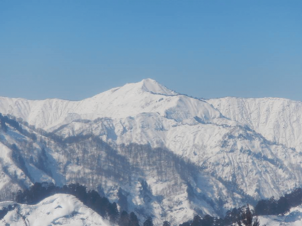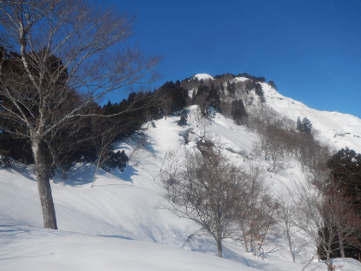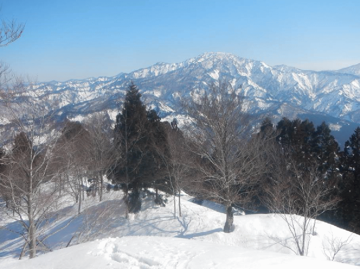 全国的の晴れ予報の日。先週登頂できなかった大方山に行きたい≠ニいうことで、8年ぶりに登ることになった。名古津集落のバス停から山の中に入る。先週のトレース跡がうっすらと残っている。大変なラッセルだったということだが、今週は雪が締まっているので歩きやすい。