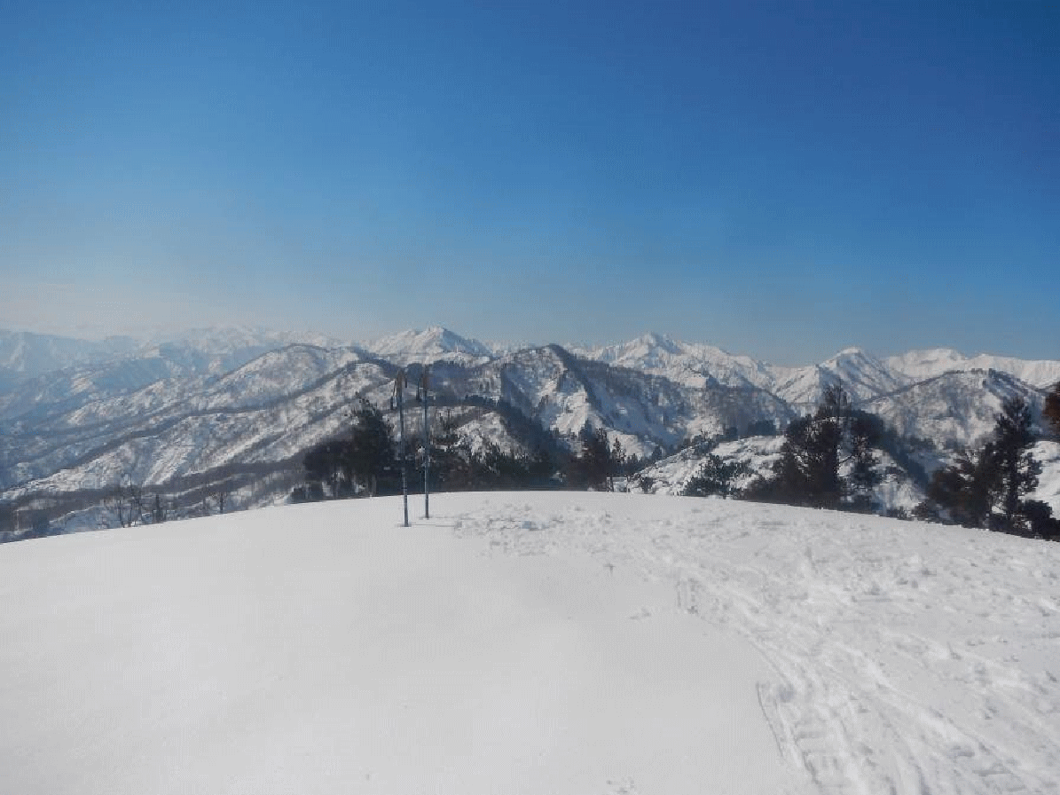 555mピークに上がると明瞭な尾根道となり、山頂に続いている。もっと広い雪の斜面が続いていたようなと話したら、「木々が育ったんじゃない?」と言われた。そうか8年ぶりだものな。山頂からの展望は変わらず素晴らしかった。川内山塊の山々の展望台となる山頂だ。誰もいない静かな山頂。低山でも雪は楽しいフィールドを与えてくれる。