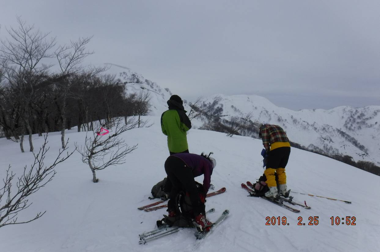 今回はメンバーの都合で日程が2月下旬になった。もう一度降雪を期待したが春の訪れが早く深雪はまったく無かった。駐車場から道路の側壁に取り付く、雪は硬く斜度もきつくシールは効かないのでスキーを担ぎキックステップで登る。朝日のあたる斜面に出てようやくシール登行に切り替える。気持ちの良いブナ林を登って行くと大きな急斜面につきあたる、これを登ると瘦せ尾根になりやや硬い雪面を慎重に雪庇のよこから稜線にでる。目の前に真っ白な鉢伏山頂上、昔の思い出がよみがえる。稜線はクラストしていたが頂上までシールで登れた。頂上では薄曇りながら飯森山や栂峰、はるか飯豊の眺めを堪能し、寒いので早々に退却する。往路をもどり瘦せ尾根を迂回し途中から昨日と思われるシュプールに合流した。ブナ林は適度に雪が緩み各自好きなように滑降を楽しんだ。