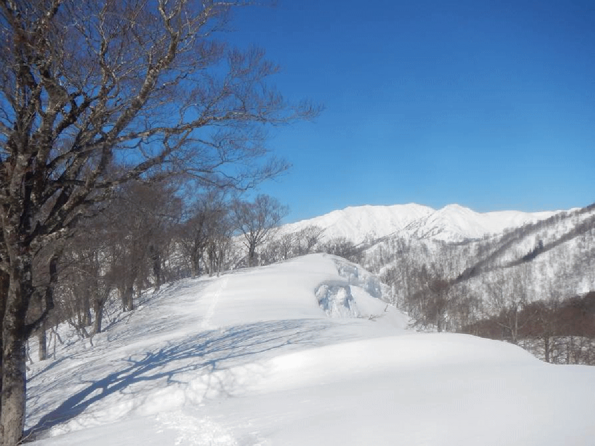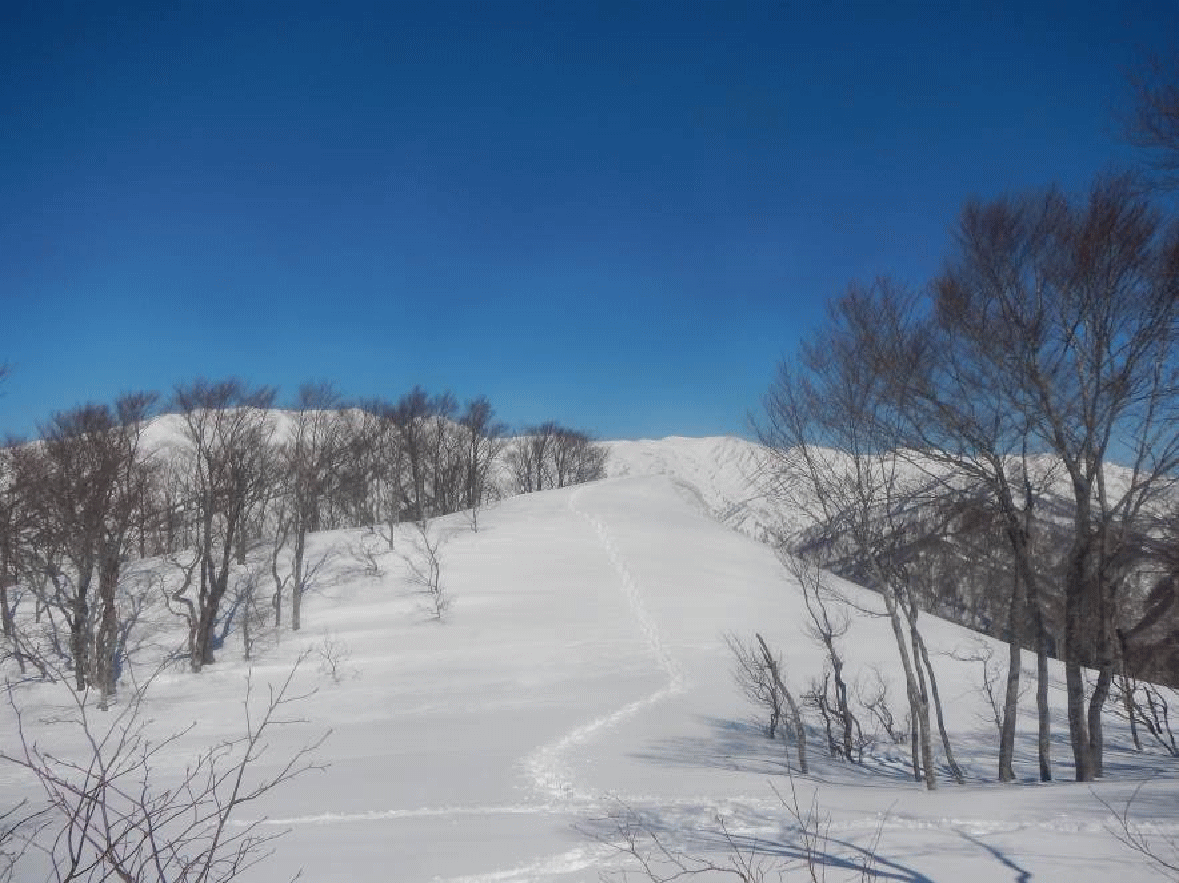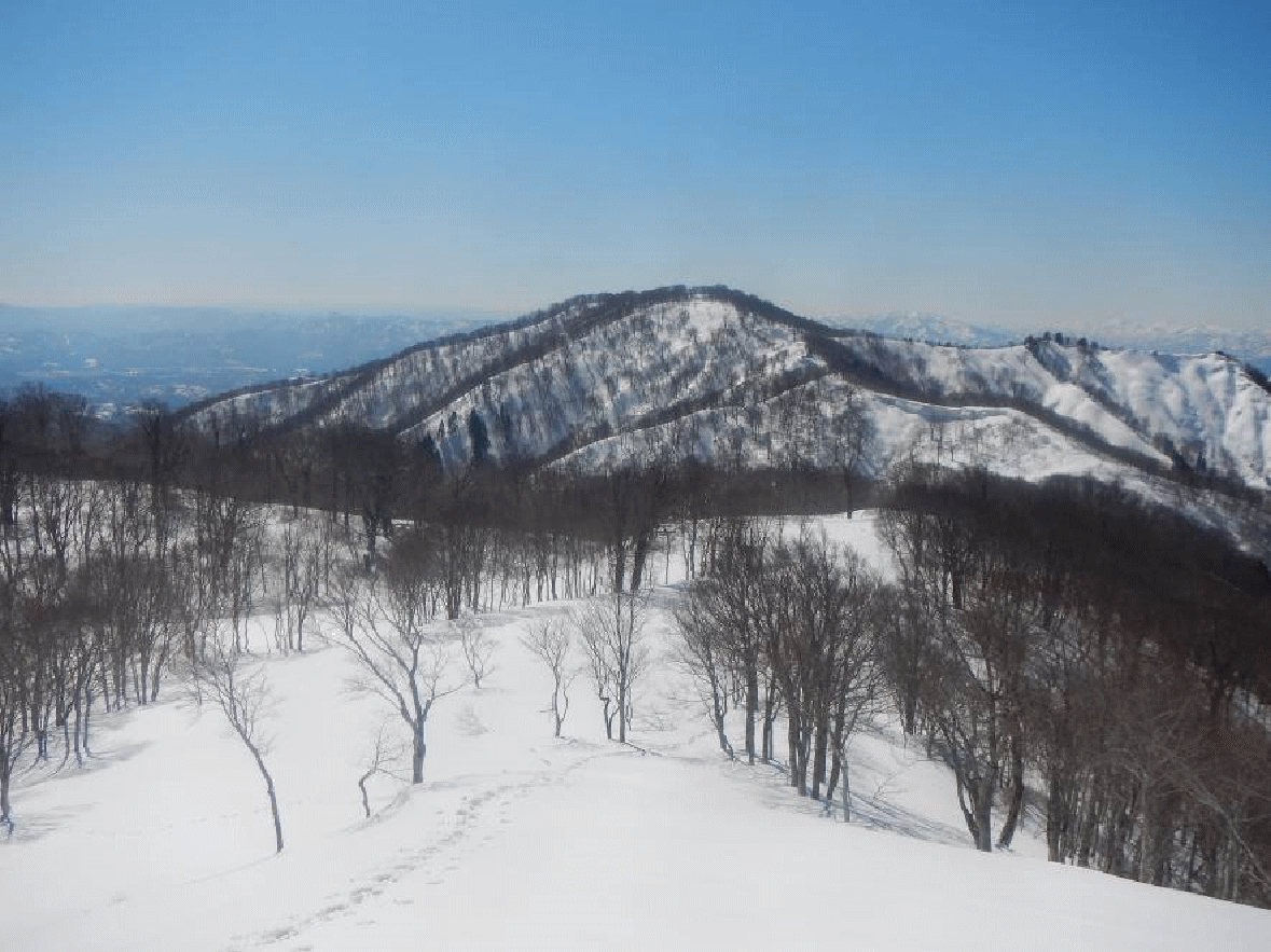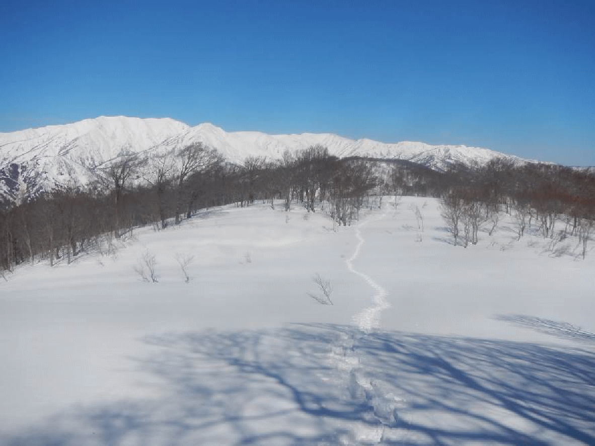 広い尾根上を行くルートで危険個所はない。ブナ林と雪原が広がる緩やかな山々を越えるルート。ナイフリッジもないし、雪崩の跡と遭遇することもない。前回歩いた魚沼アルプスは険しかったなあと思いながら、気温が上がりグサグサとなった雪の斜面を下ってきた。