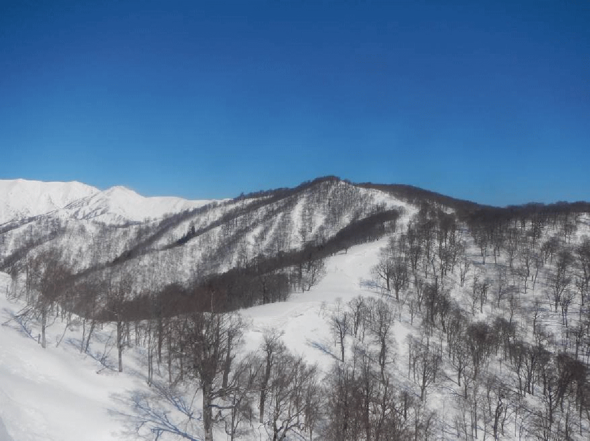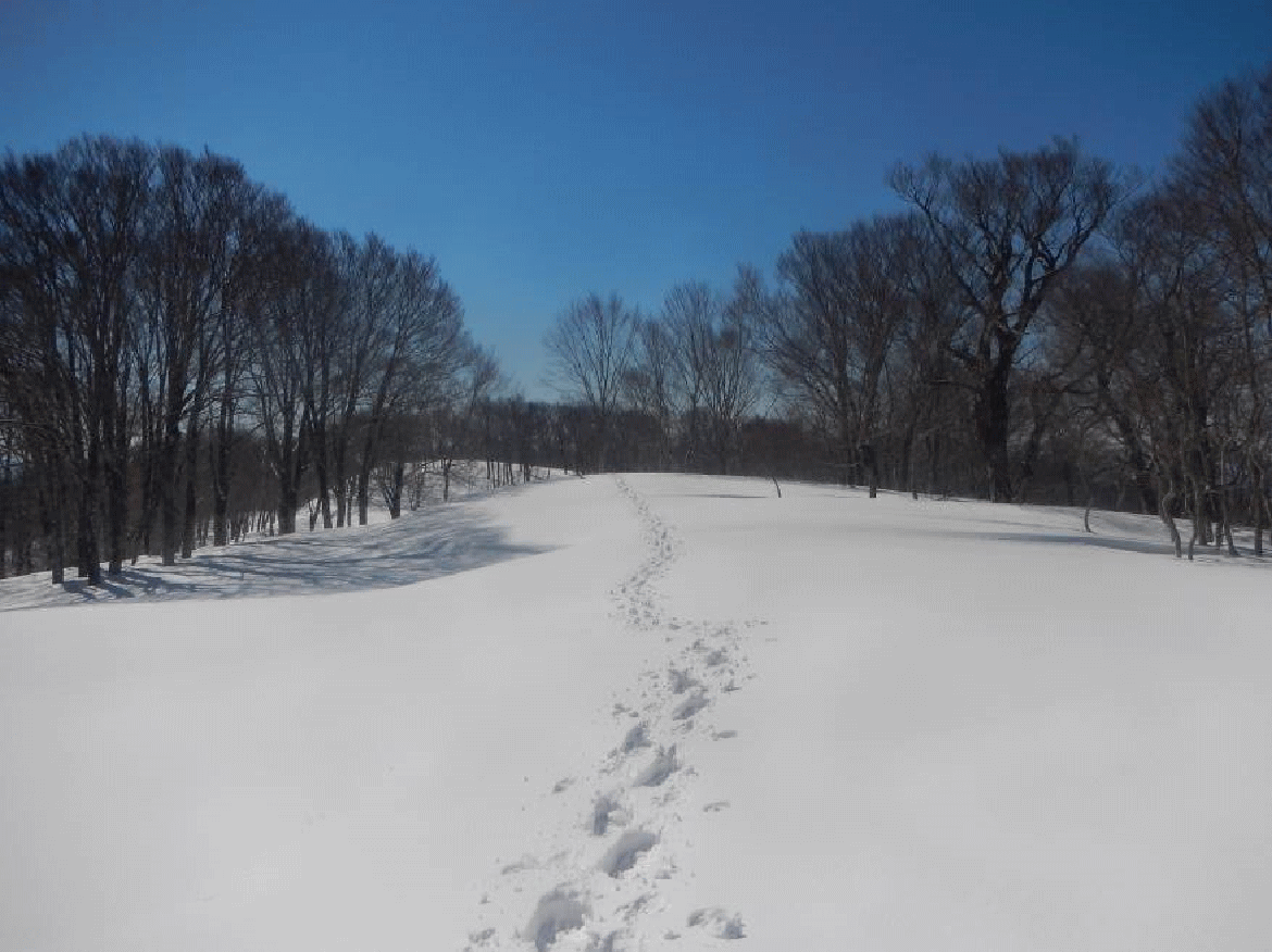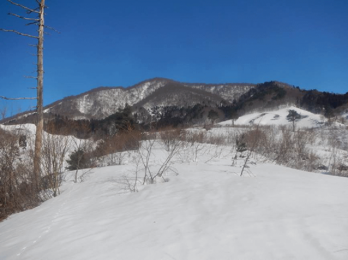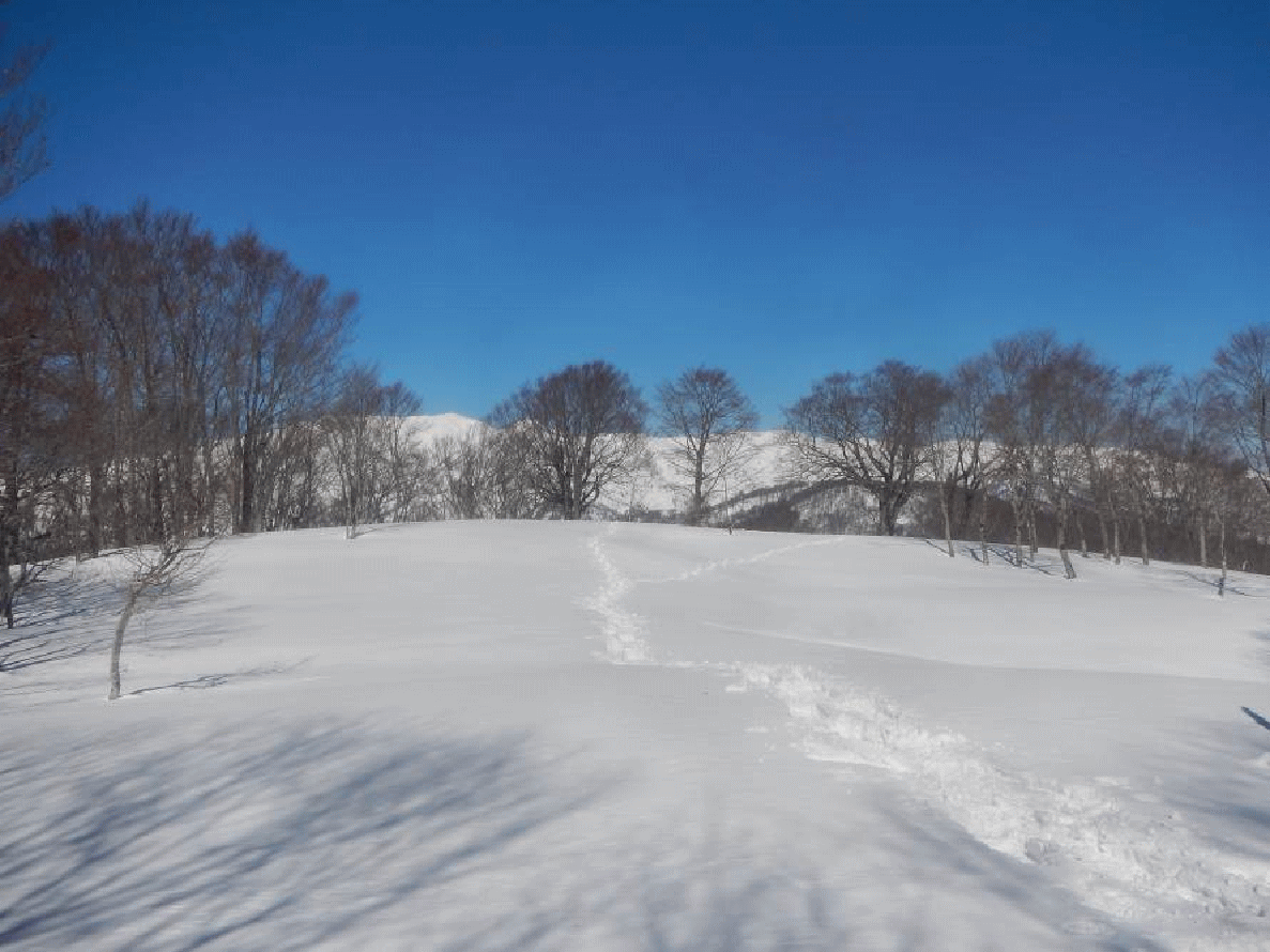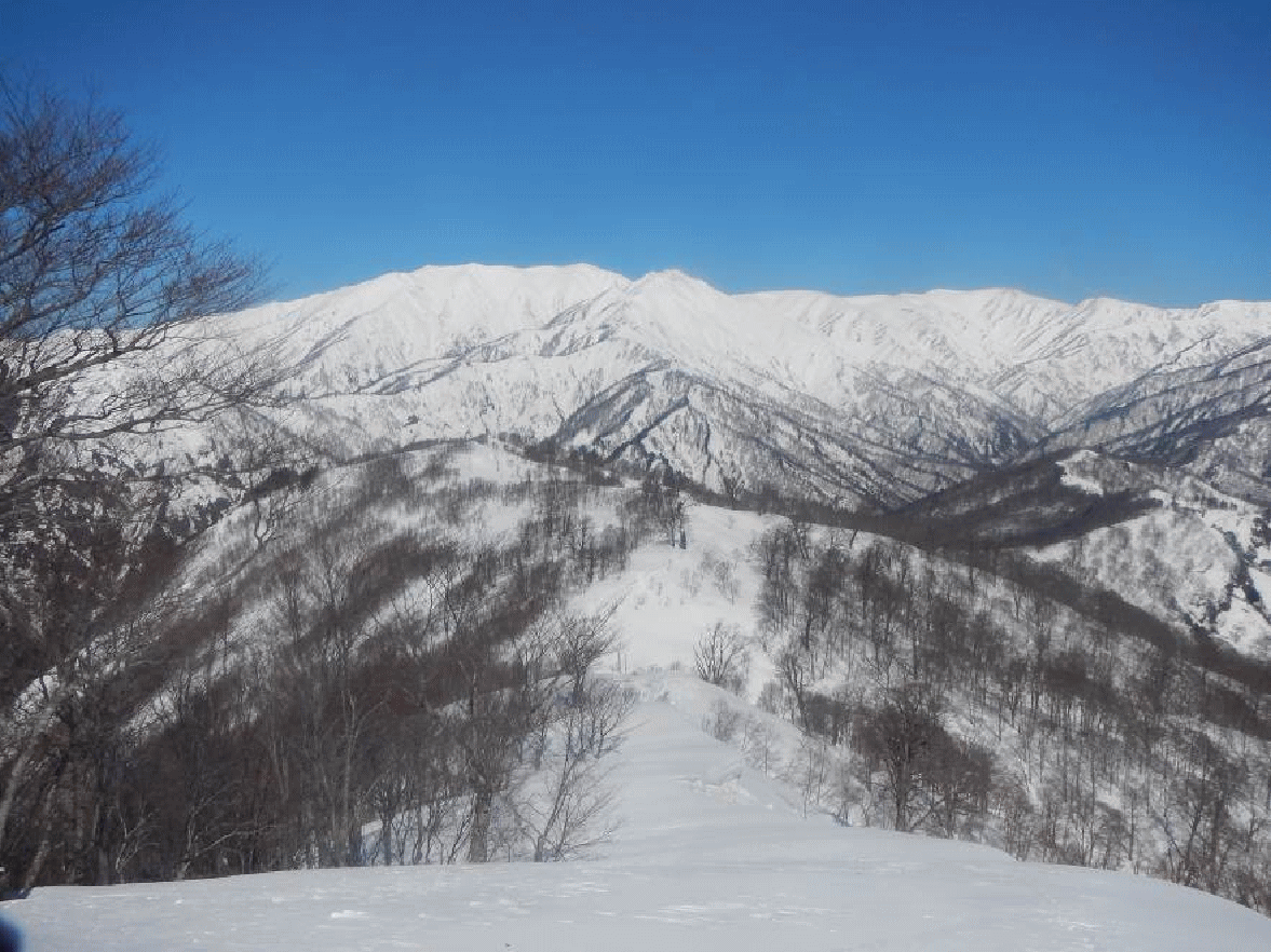 広い尾根上を行くルートで危険個所はない。ブナ林と雪原が広がる緩やかな山々を越えるルート。ナイフリッジもないし、雪崩の跡と遭遇することもない。前回歩いた魚沼アルプスは険しかったなあと思いながら、気温が上がりグサグサとなった雪の斜面を下ってきた。