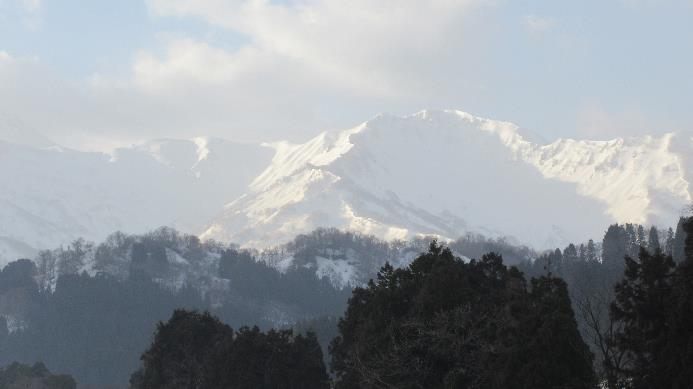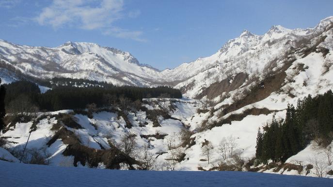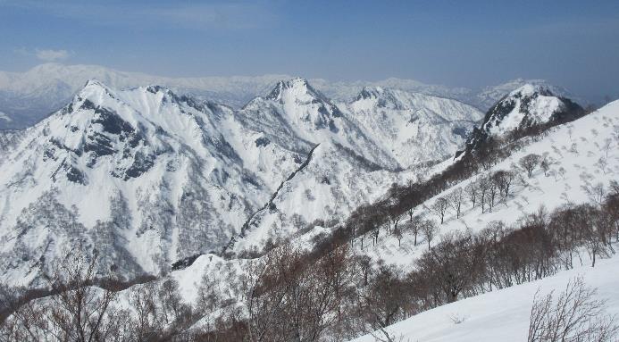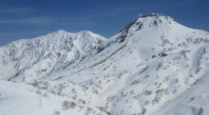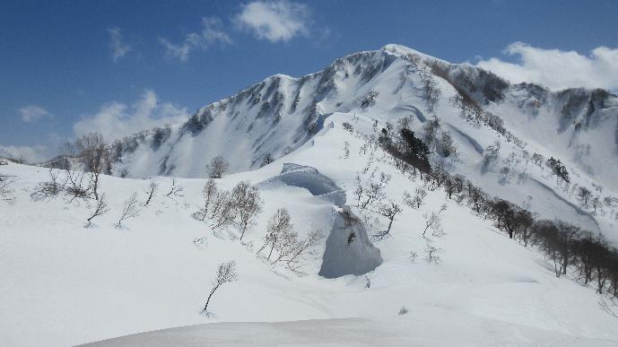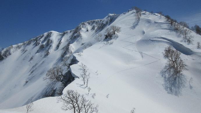 山頂の手前で先行者がスキーで降りてきたのでトレース拝借の礼を言った。彼は「初めて来たけれど大変なところなんですね」と言って昼闇谷の方に向かって滑って行った。