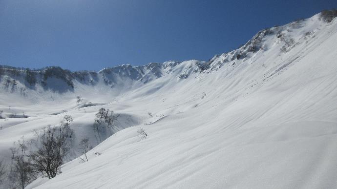 快適な斜面を下ると巨大なカール状地形の底に立つ。白い壁にぐるりと囲まれ、とても低山の景色とは思えない。ボキャブラリーに乏しい自分にはただ「すごい」としか言いようがない。
