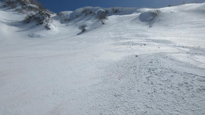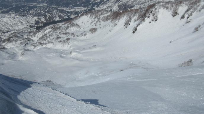 自分は登ってきた道を少し戻り雪庇の切れたところからエントリーする。滑り込んだところは夜中に降った雪がサラサラの状態で残っていた。