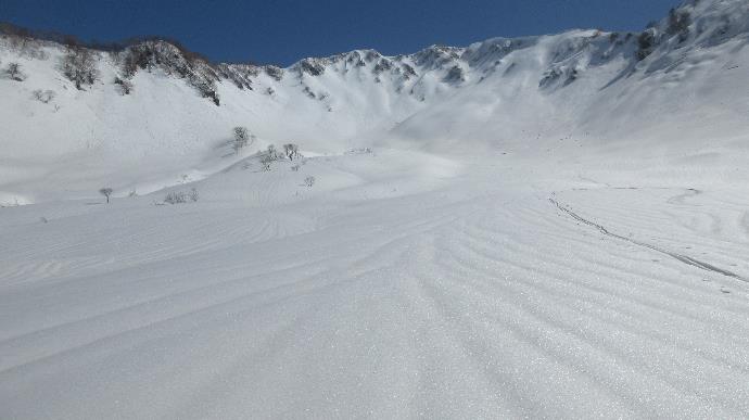 一帯はまだ雪崩がなくきれいな状態だが、これから雪庇が落ち始めると雪崩の巣になるのだろう。