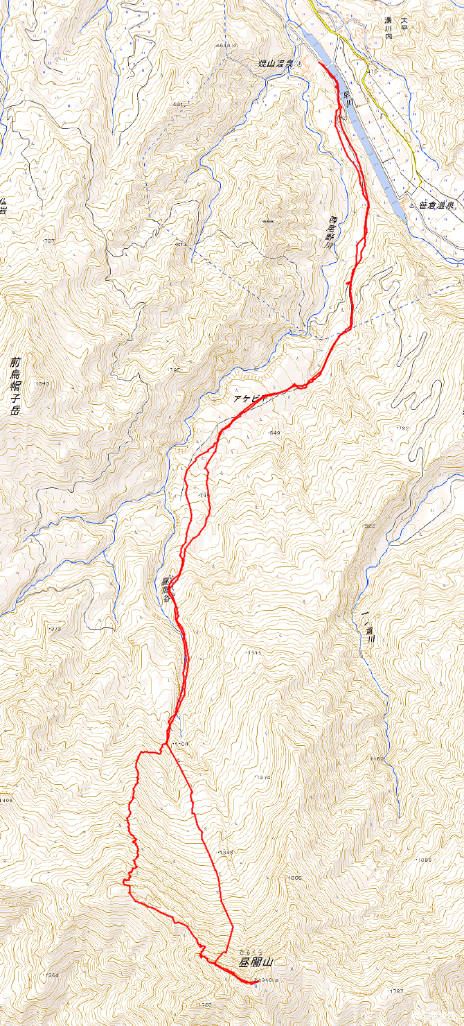 【時間記録】 焼山温泉6:55 – 左岸尾根取付き点9:30 – 主稜線11:15 – 昼闇山頂12:45 ~ 13:15 - 左岸尾根取付き点13:45 – 焼山温泉14:45