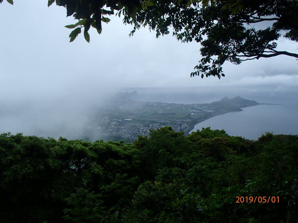 天気が悪いので長居も出来ず、早々に下山を開始する。途中雲が切れ、五合目の展望台から、指宿の海岸線が見えた。