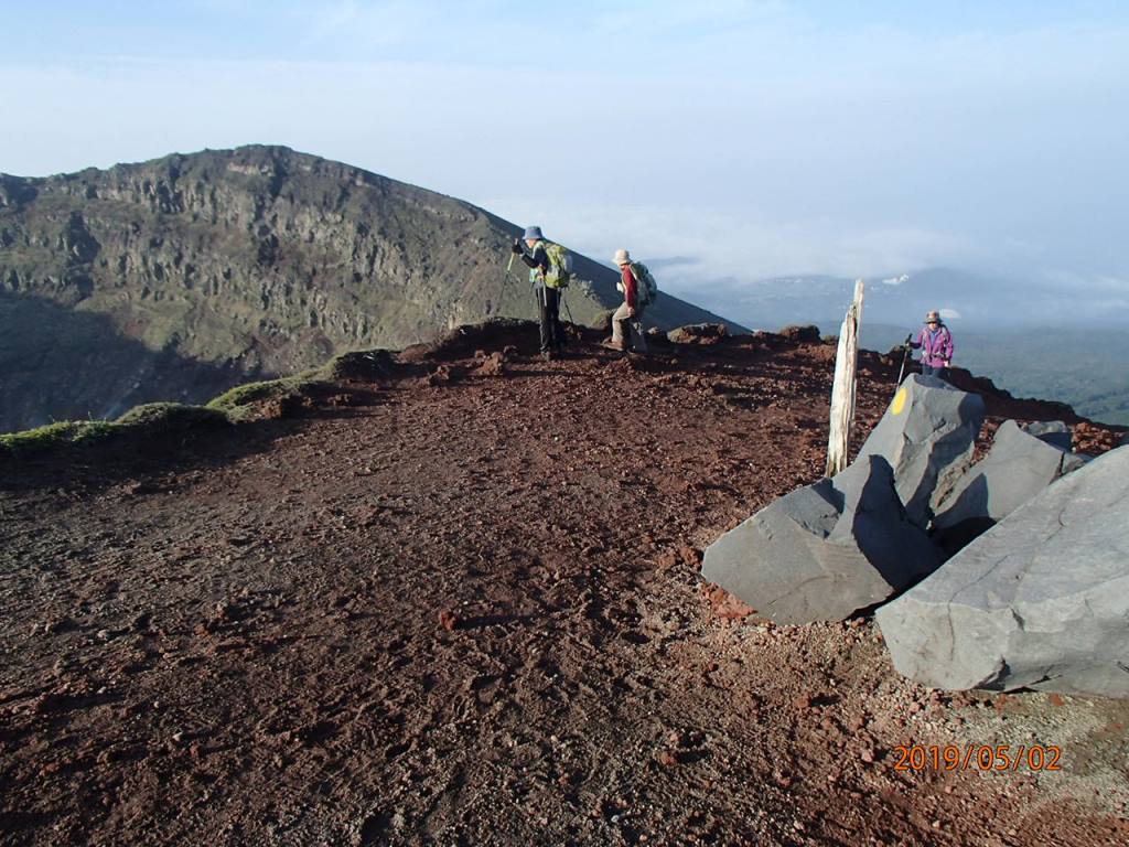 目の前のピークを登ったところが御鉢とよばれる火口部分の頂上である。下の駐車場から見えているのはこのピークで、これが高千穂峰とおもっていたが間違いであった。