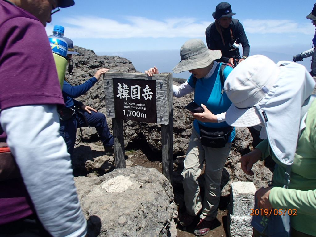 ようやく韓国岳山頂に到着。大勢の人が休んでいる。山頂は記念写真をとる人で順番待ちの混雑。