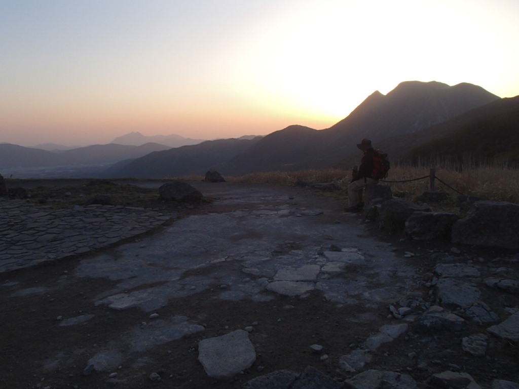 翌朝、5時過ぎには牧ノ戸峠駐車場に行ったが、すでに満杯に近くなっていた。運よく真ん中位に1台分空いており、車を止める。夜明けと共に出発だ。