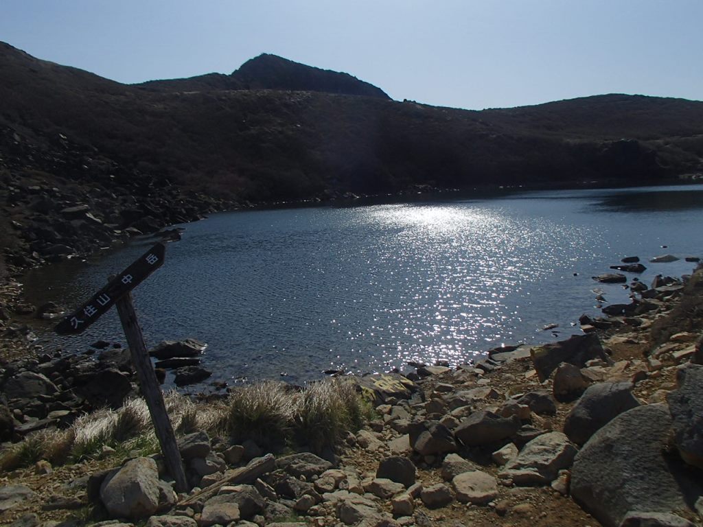 九重連山の最高峰である中岳に向かう。途中の御池は美しい山頂湖である