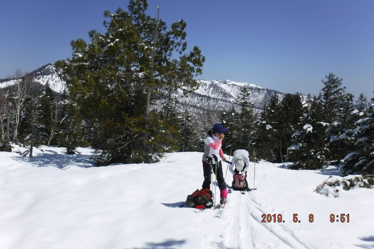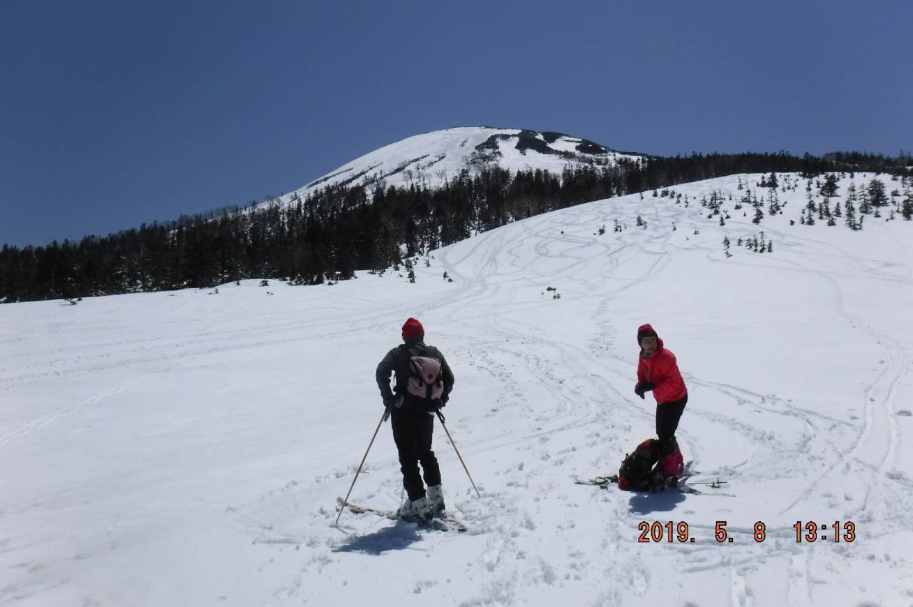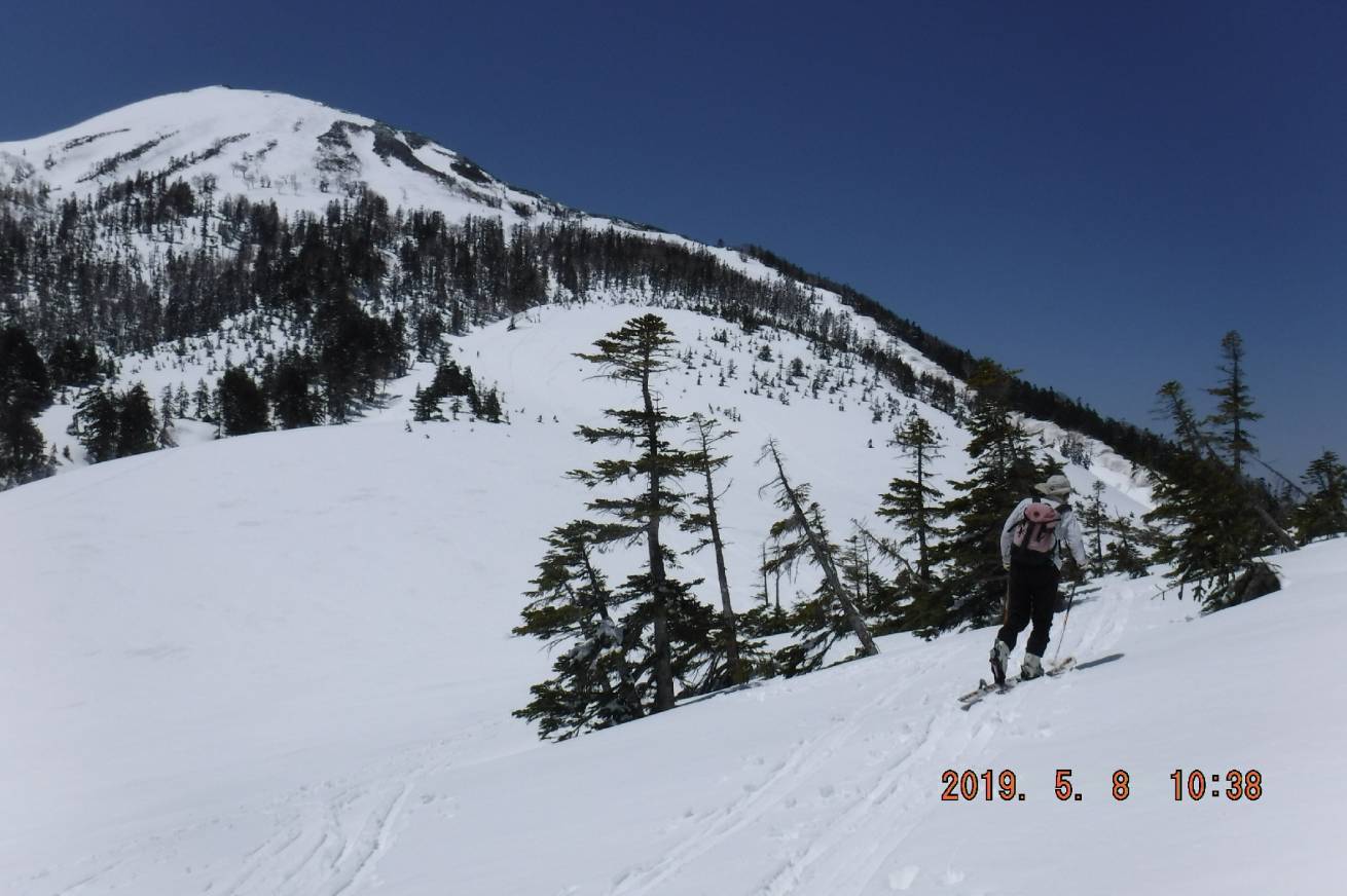熊沢田代に戻って頂上を振り返る。この後私だけ滑り易い所を選んでいたらメンバーと離れてルートを大きく右により過ぎ東ノ田代経由で沼山峠林道に降りてしまった。メンバーに心配をかけてしまい申し訳なかった。