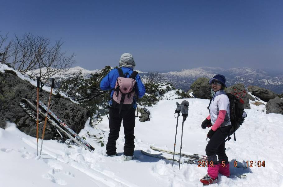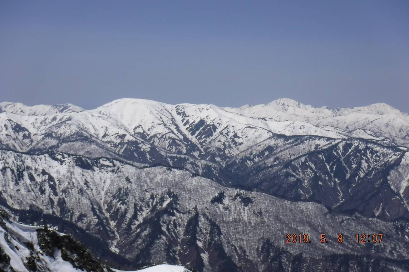 正面に奥深い平ヶ岳や越後駒、中の岳、荒沢岳の裏越後三山縦走路の稜線、さらに遥かかなたに飯豊の白い山波も確認できた。写真に収めなかったが尾瀬ヶ原から至仏山、笠ヶ岳、上州武尊山などの山座同定に楽しい時間を過した。