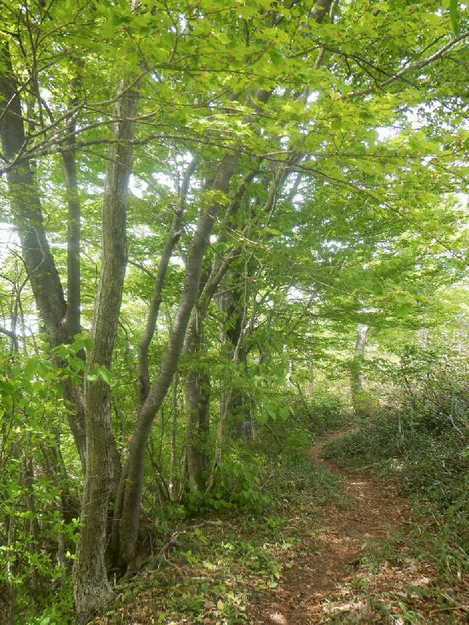 駒ノ湯の登山口には車が数台止まっていた。道行沢に架かっている吊橋を渡り、小倉尾根に取り付く。最初はジグザグと登っていくが、646mピークからは緩やかなアップダウンの続く尾根歩きとなる。明瞭な道で雪は無く、新緑の中、タムシバやイワウチワなど早春の花が咲いている。