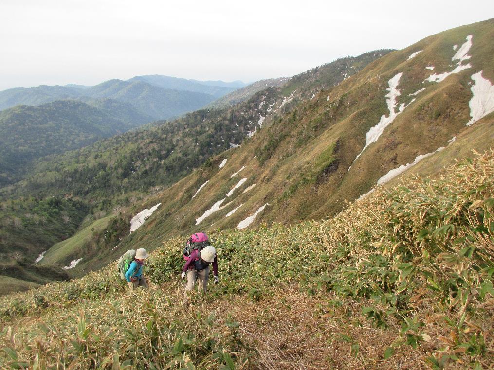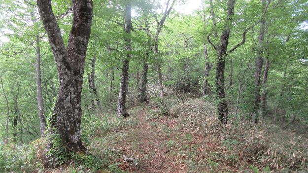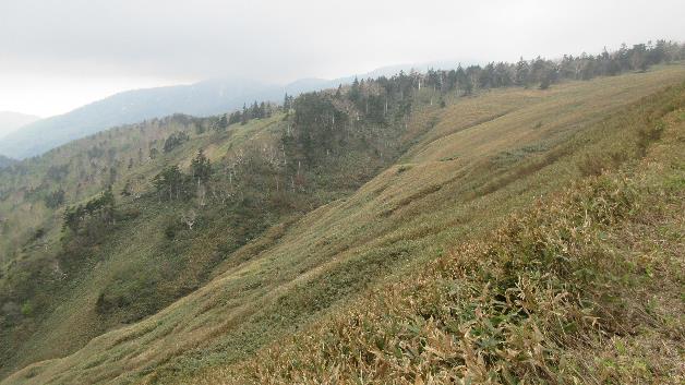 緩いアップダウンを繰り返してなかなか標高をかせげないと思っていたら急な登りが2カ所出てきた。2カ所目の急斜面を登ると樹林帯が終わり広大なササ原となった。