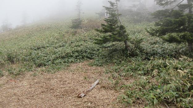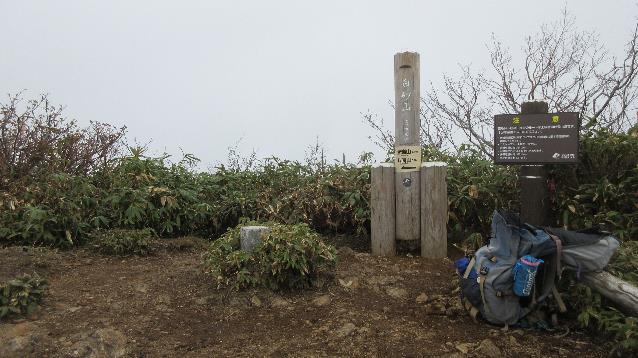 ガスはさらに濃くなりすっかり展望は効かなくなった。ゆるいアップダウンを繰り返しているといきなり目の前に白砂山山頂の木柱が現れた。