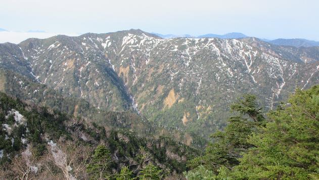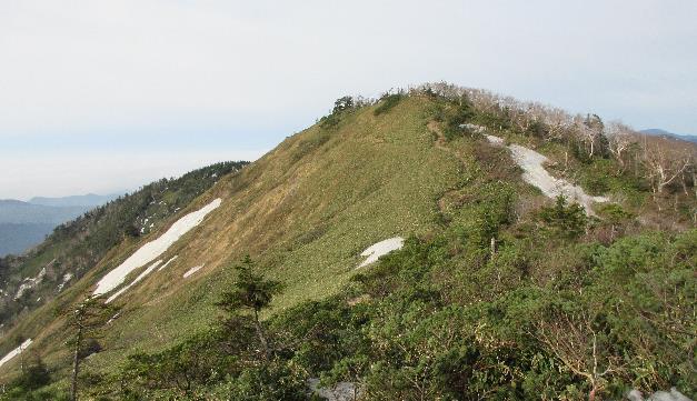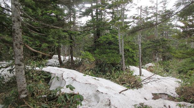 残雪が点在するササ原を行くとオオシラビソの林となり平らな山頂のセバトの頭に着く。林内は残雪が多く注意していないと道を見失う。