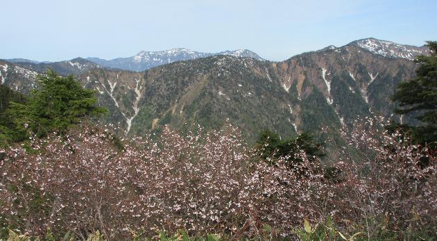 《佐武流山から白砂山に続く稜線 手前はミネザクラ》