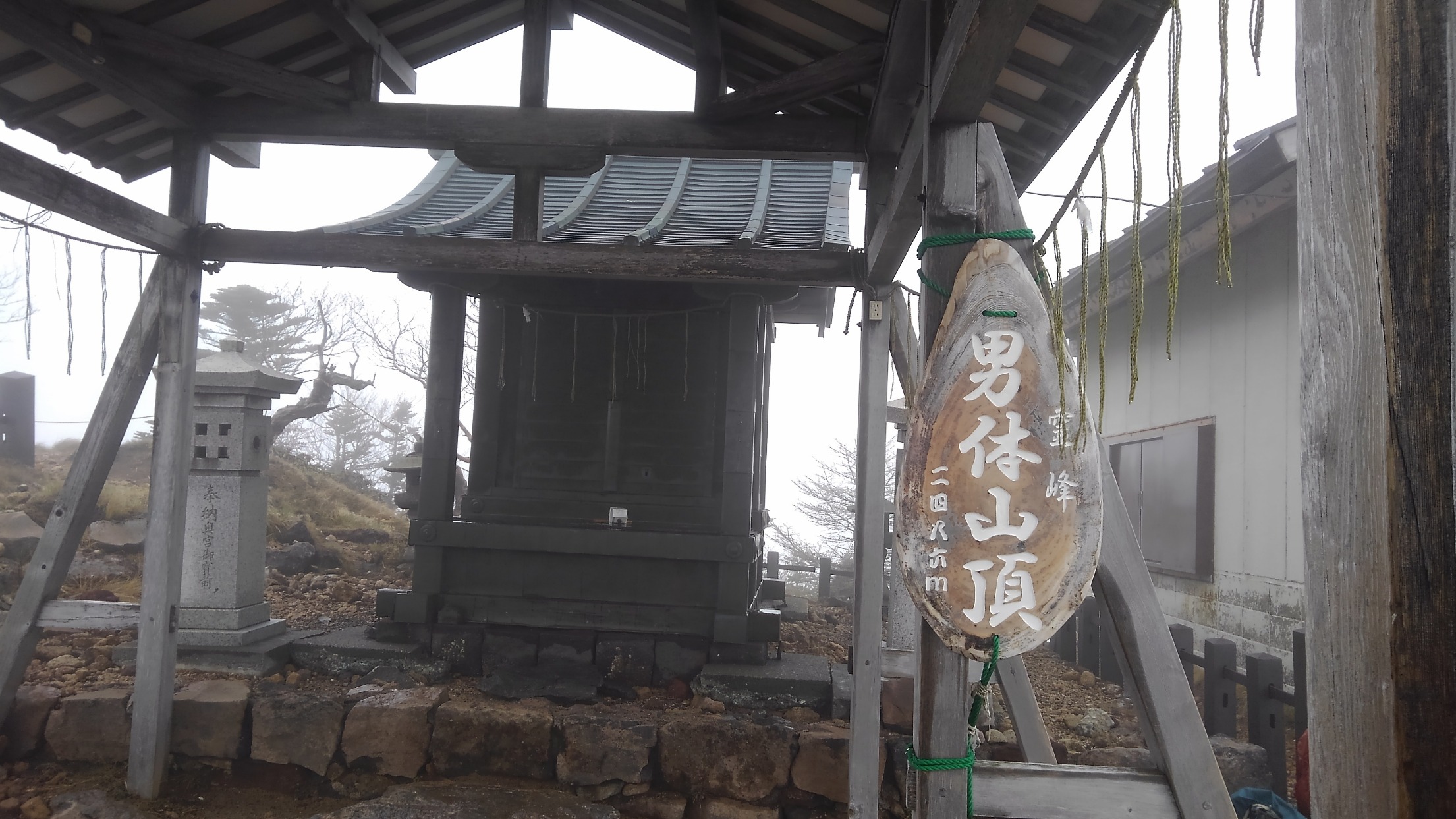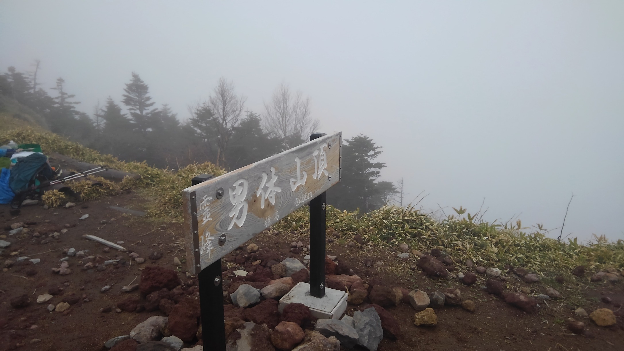 9日二荒山神社から晴れそうなガスの中山頂に息たいだいに登るがガス上がらず男体山からの展望なし。