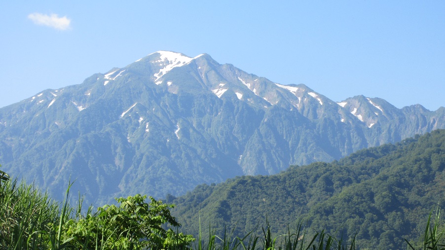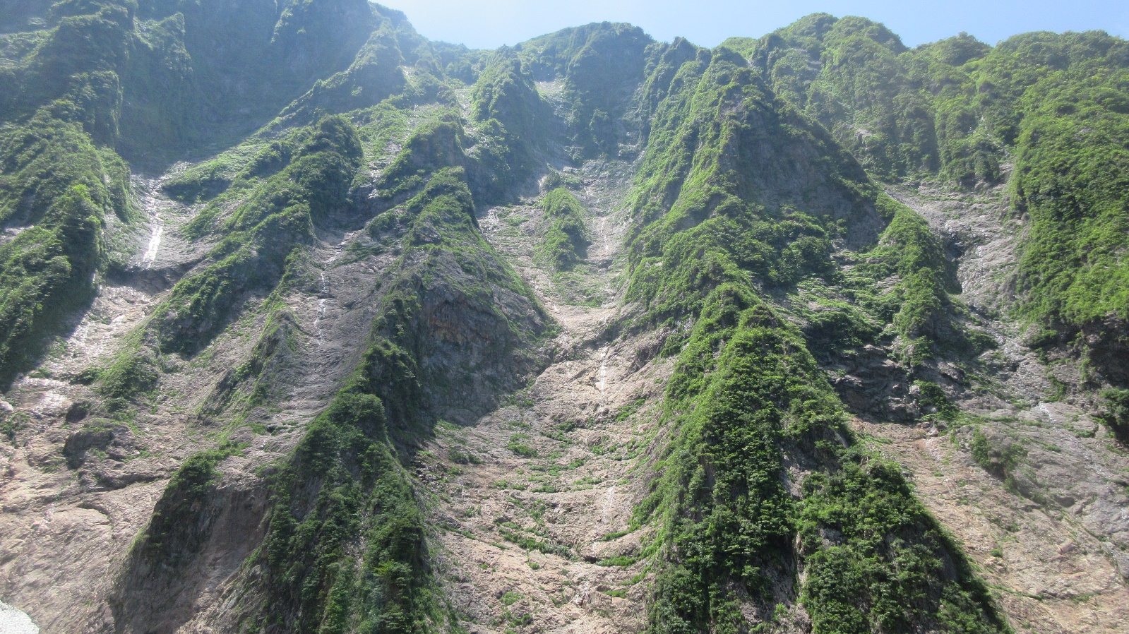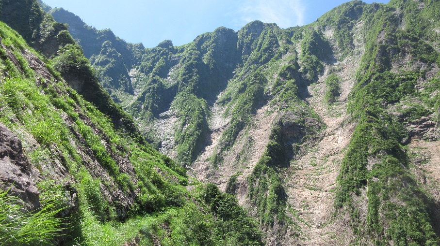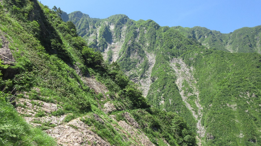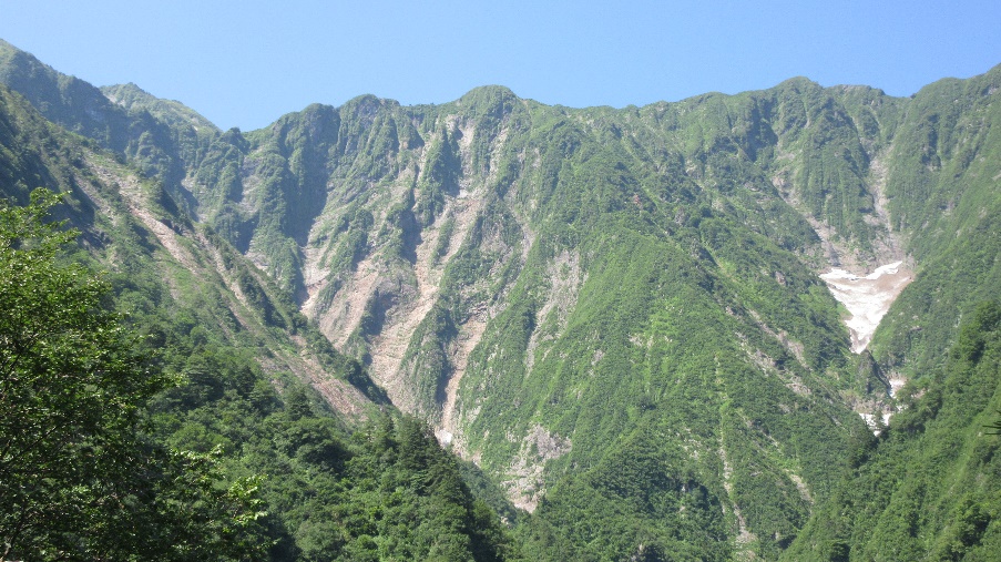 《左が金山沢奥壁、右が雪山沢、稜線は郡界尾根》