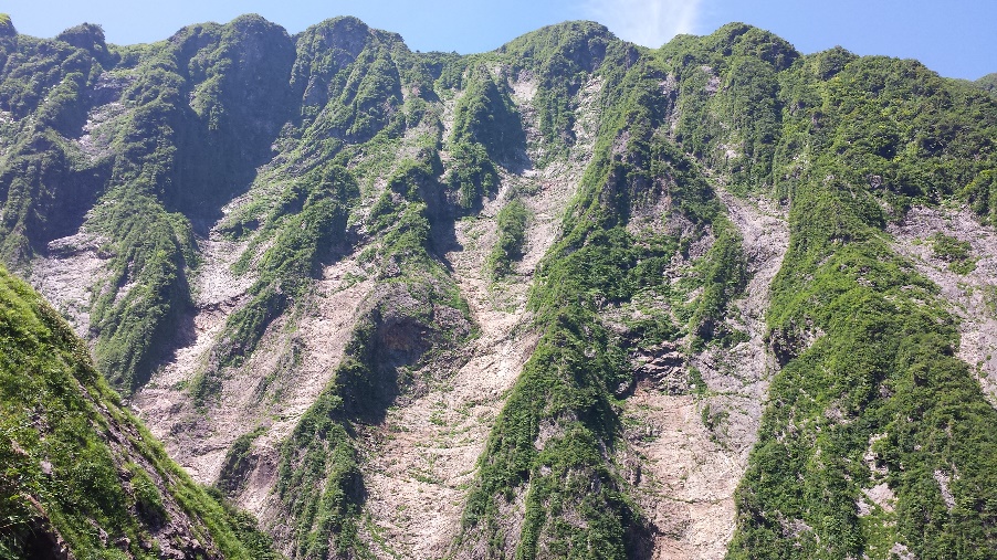 金山台地といわれる小平地に着くと雪渓のある金山沢を挟んで目の前に巨大なスラブ群が広がる。安物カメラではめいっぱいワイドにしても全容がおさまらない。