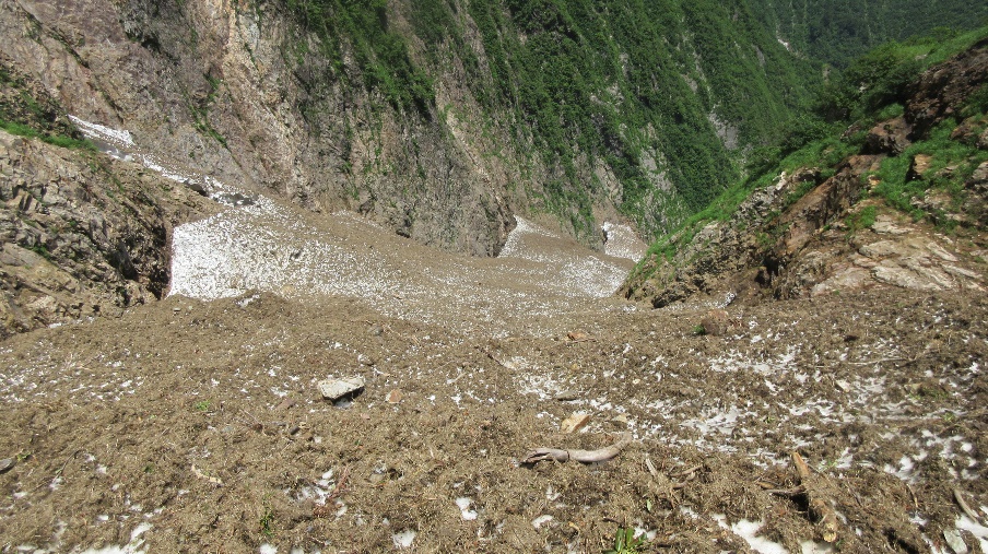 対岸の壁まで行ってみようと雪渓まで降りたが、シュルントが大きく口を開けていて近づけない。
