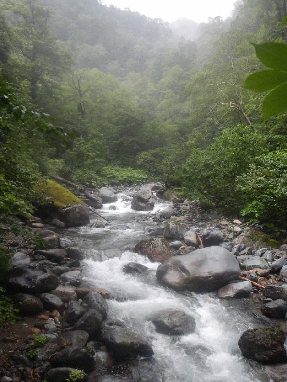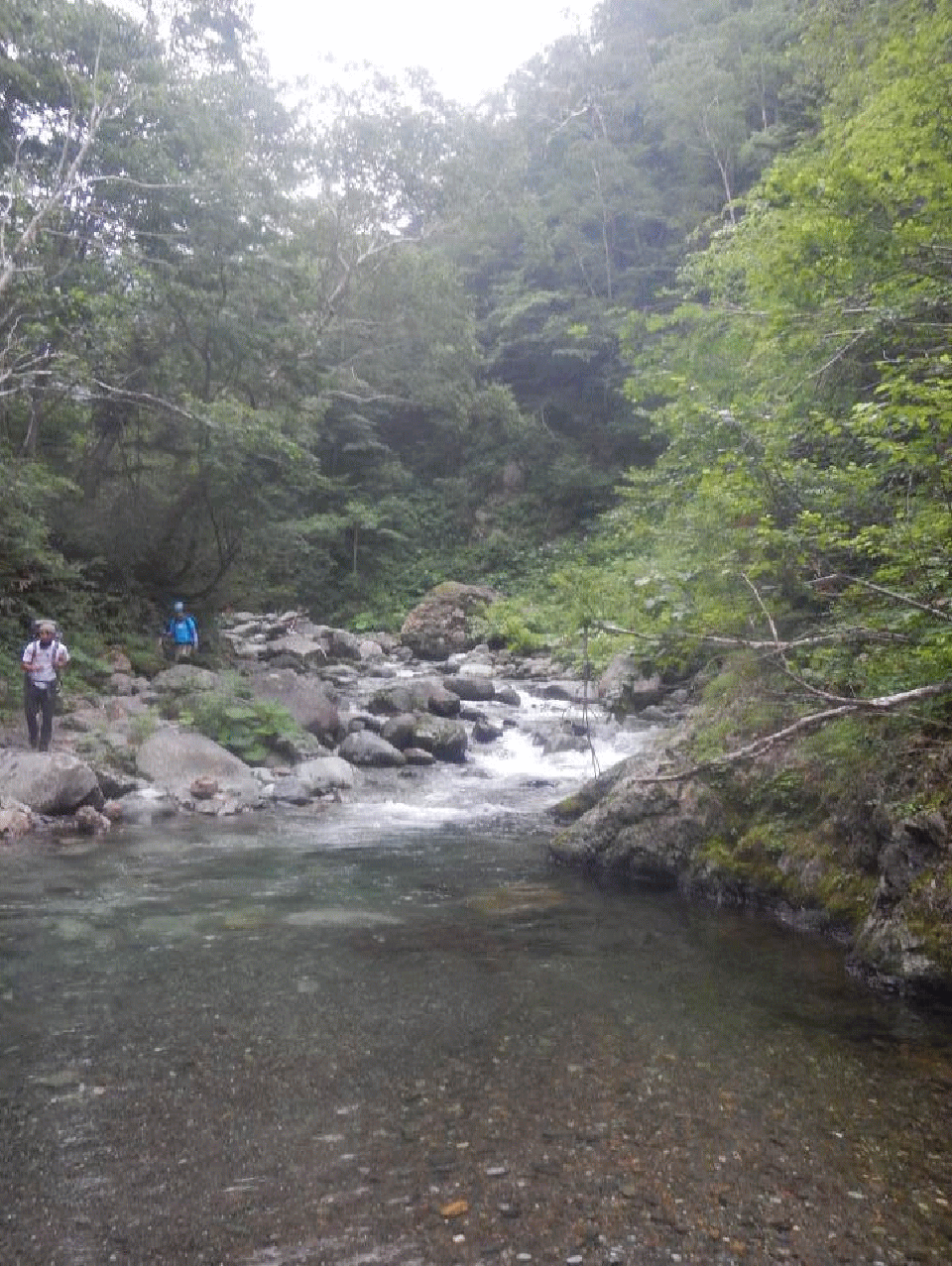 前日に札幌入りし、朝、登山ゲートとなるとよぬか山荘に向かう。とよぬか山荘からシャトルバスに乗り換えて第2ゲートまで入り、まずは林道歩きだ。小雨模様の天気。2時間ほどで林道は終わり、額平川に沿って渡渉を繰り返しながら歩くことになる。沢水は冷たくは感じない。水量は少ないとのことだが、深い所では膝上まで潜っただろうか。15回ほど渡渉を繰り返し、幌尻山荘に着いた。管理人がいる小屋で素泊まりのみ。ビールだけが売っている。
