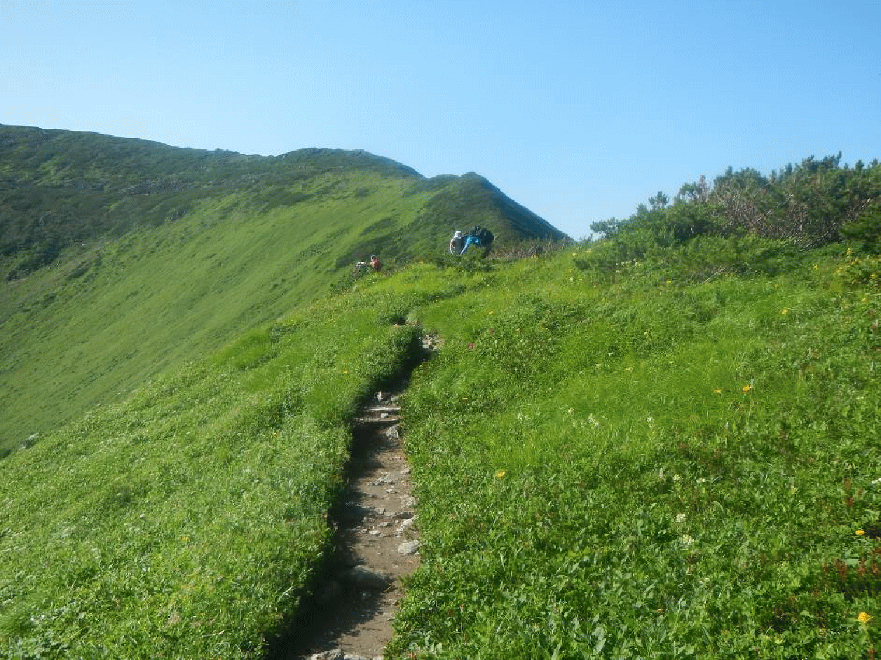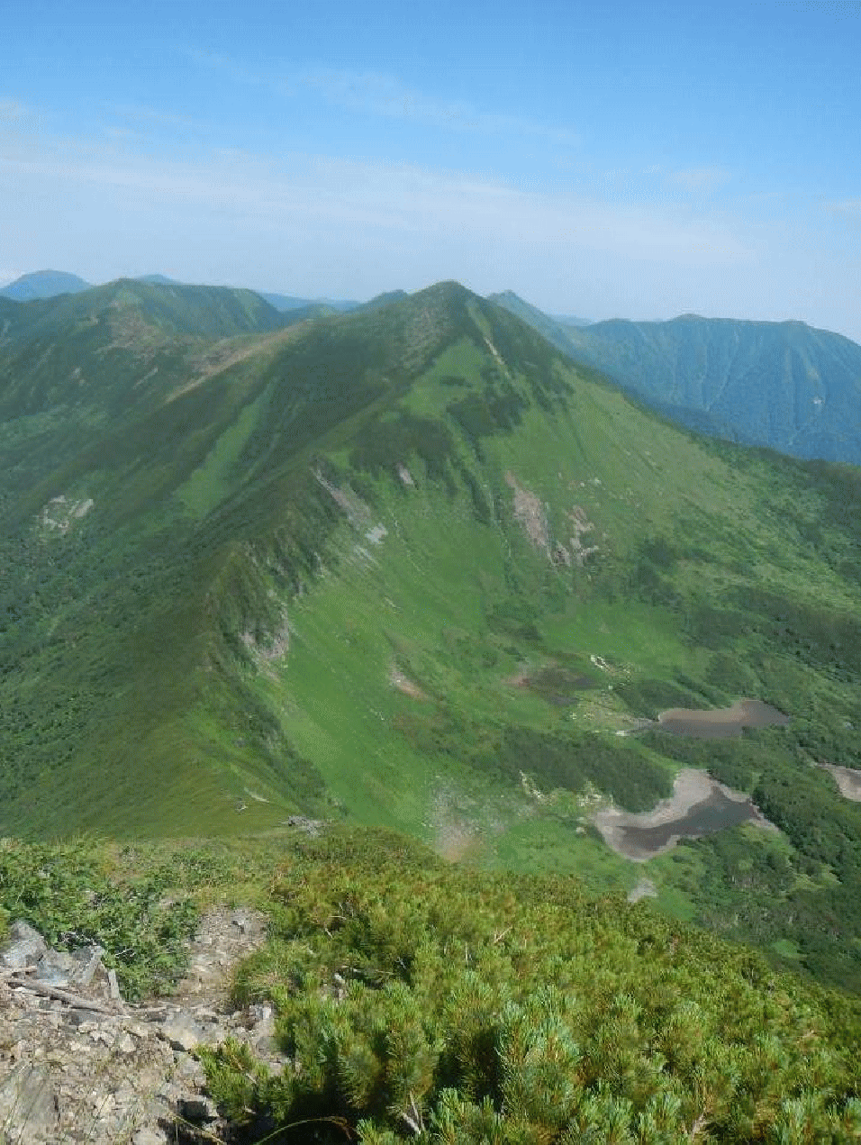 翌日は快晴の天気となった。樹林の中、ジグザグの急登を登っていく。途中命の泉≠ニ名付けられた水場があり、冷たい湧水がコンコンと流れている。水場から少し登ると森林限界を越え、視界が開けた。北カールの向こうに幌尻岳がドシリと鎮座している。そして山頂に続く尾根道はお花畑の稜線漫歩。見たことがない花々の百花繚乱の世界だ。そして、「いた〜〜!」という叫び声に目を凝らしてみると、なんとカールの底に動くヒグマの姿が。すごすぎる、日高の山。