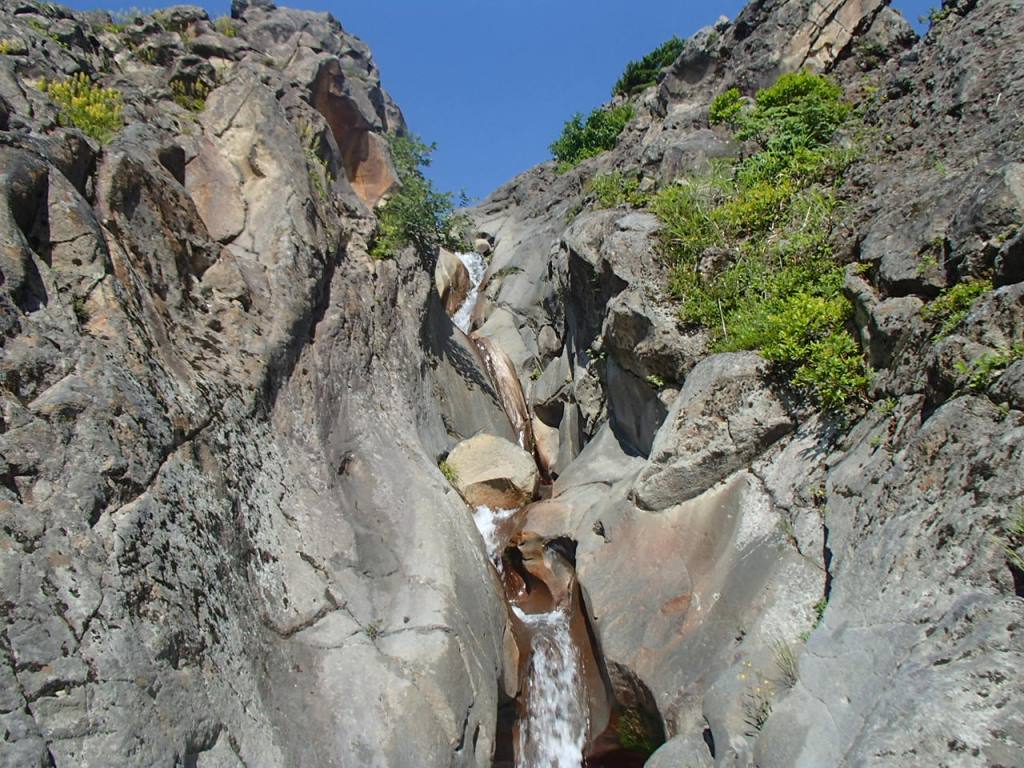 途中からゴルジュ帯となり、沢の中を進むことが難しくなり、左右の岩の上を進んで行く。源頭に近づくと更に景色が変わり、のんびりとした牧歌的な雰囲気にもなる。