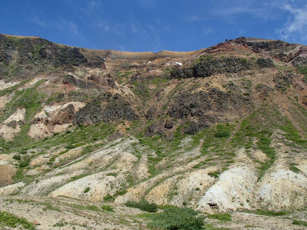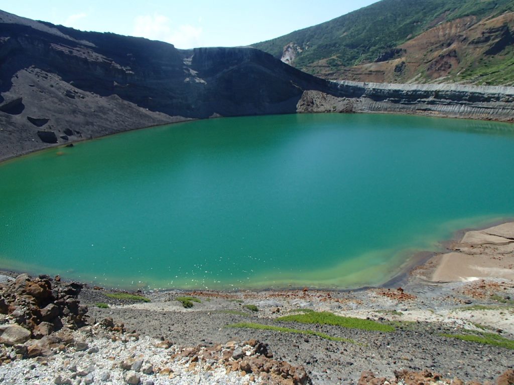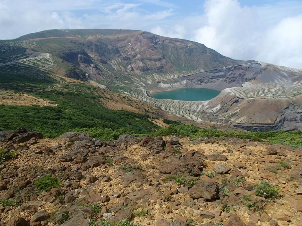 五色岳との鞍部を乗り越すと御釜の縁に出た。御釜を中からみるのは初めてであるが、透明感のあるエメラルドグーンの水面はキラキラと太陽の光が反射しとてもきれいだ。
