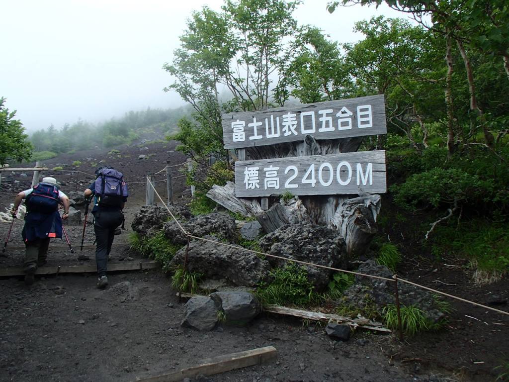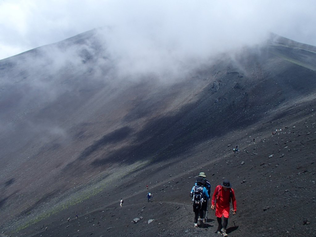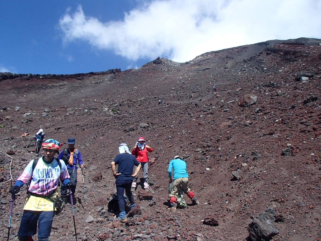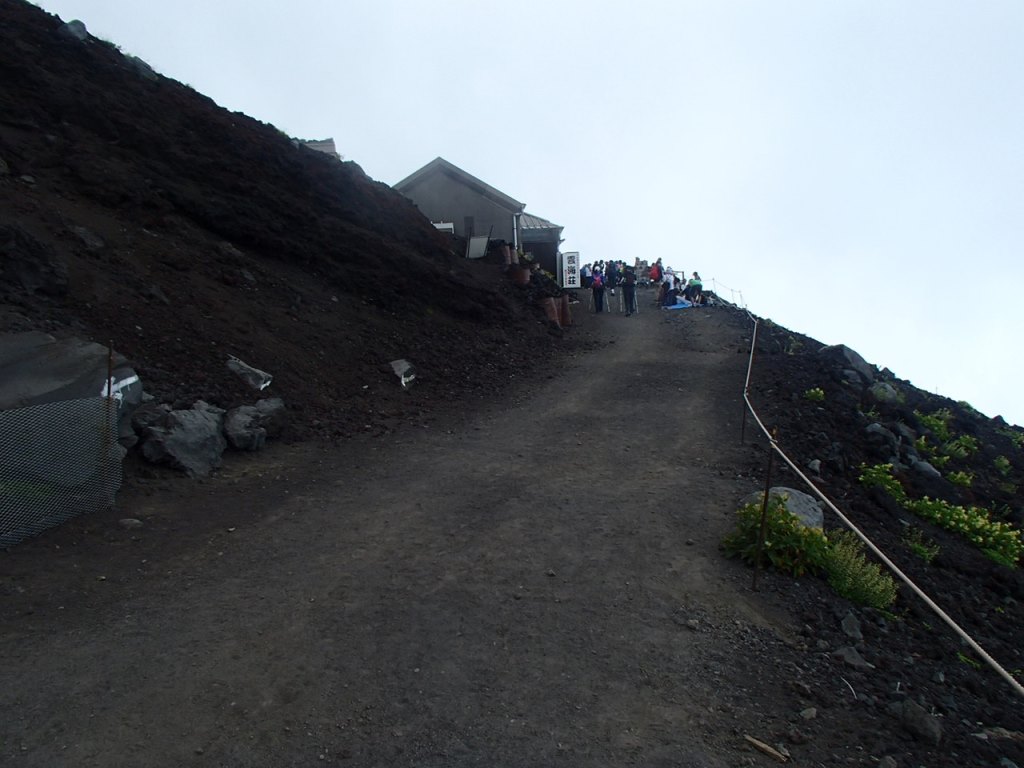 レストハウスで身支度を整え、いよいよ出発だ。頂上まで1300m以上あるが、今日の宿泊は標高2780mの御来光山荘なので、380mの登りでしかないのだが、なぜかきつい。山荘に予約で電話した時に五合目から1時間で来る人もいると聞いていたが、2時間近くを費やしてようやく到着した。