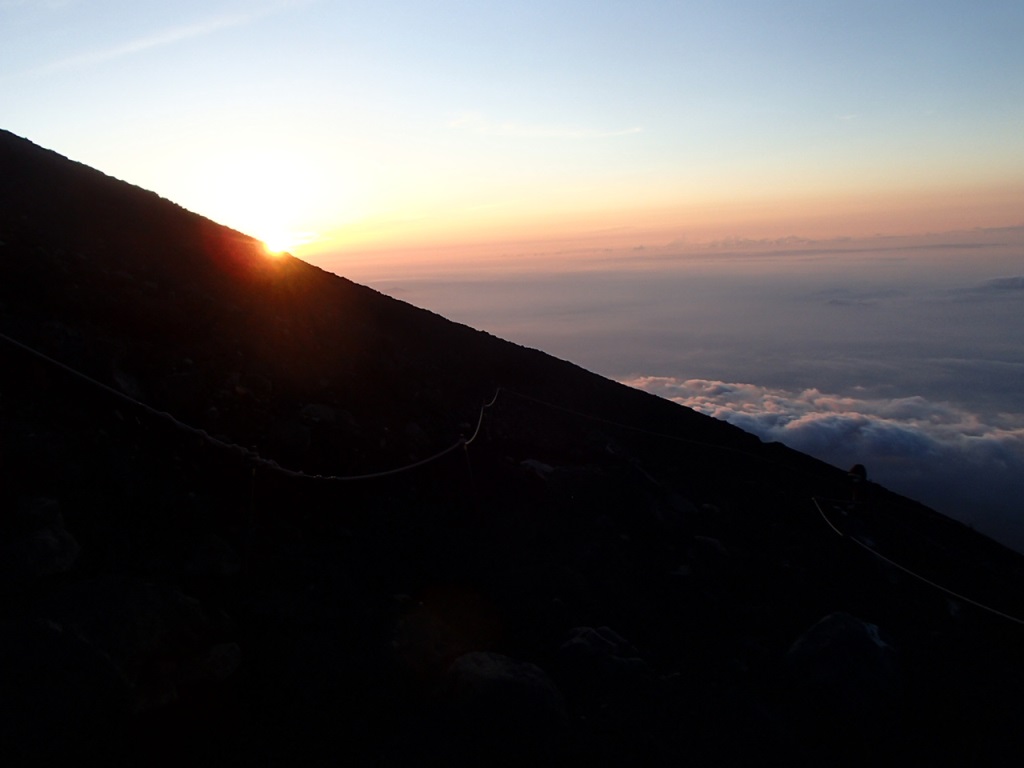 9合目付近でついに日の出となってしまった。地平線から出るところは見えず、少し登って山の斜面から太陽が出た。これでは御来光とはいえないのではないか。まあいいや。やったー。