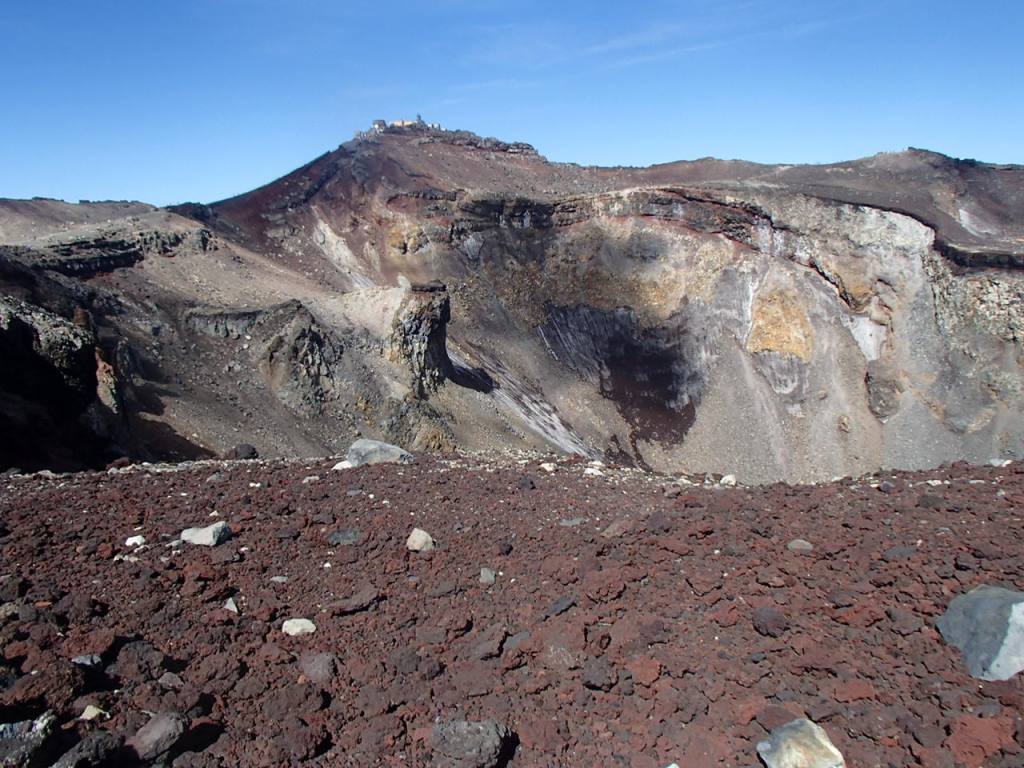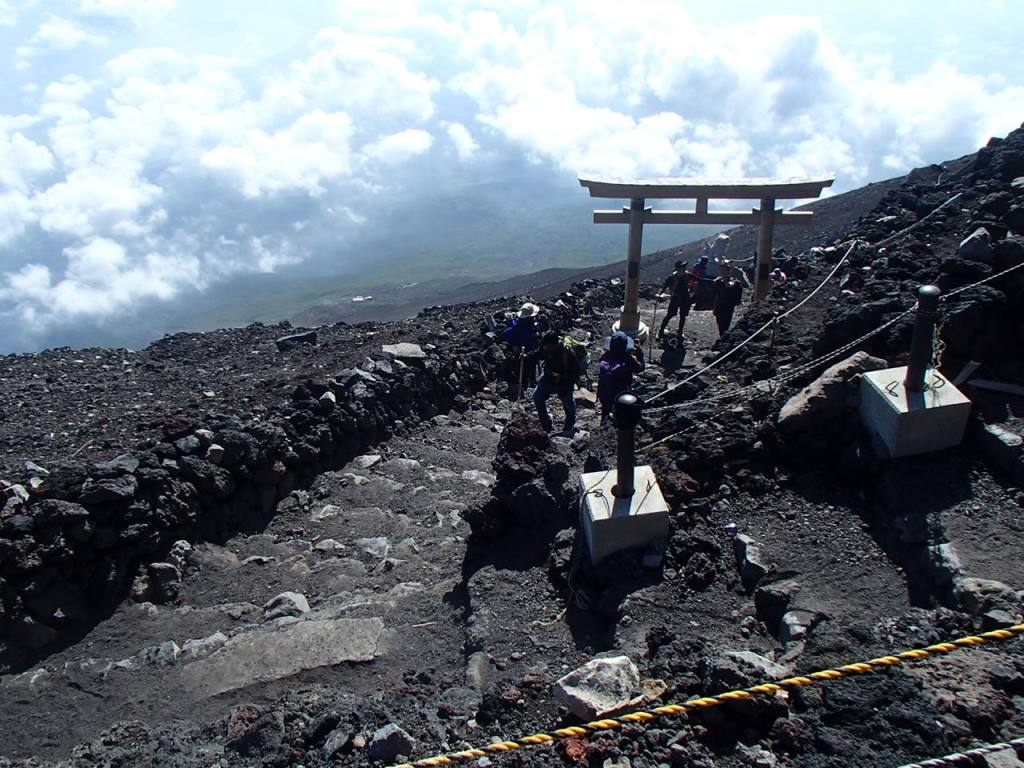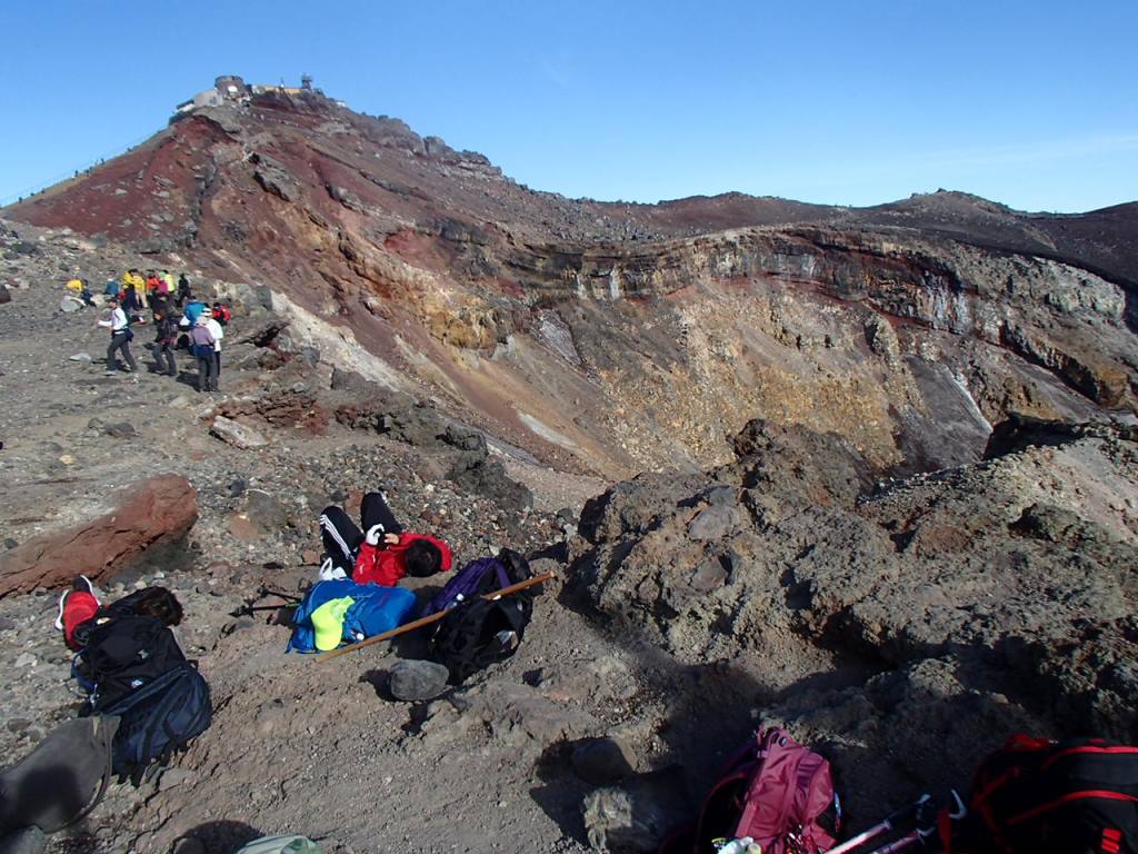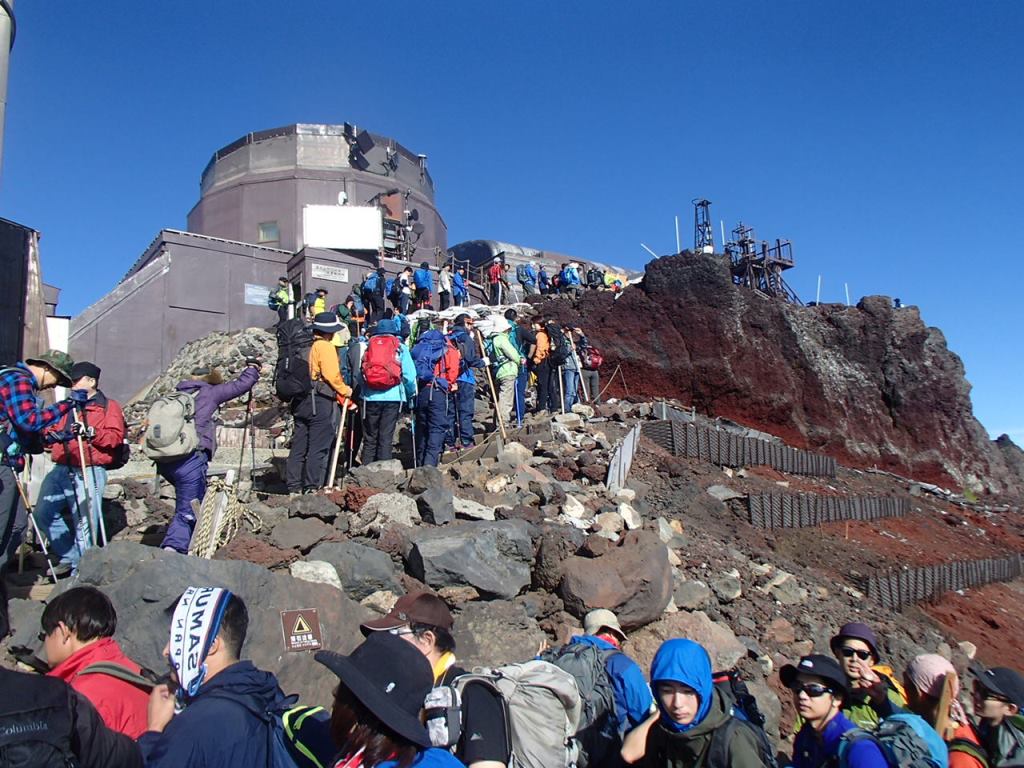 近くに測候所のあるピークがある。剣ケ峰だ。富士山の最高地点=日本の最高地点。これを登らなければ登頂とはならないのではないか。人が並んでいるようにも見えるが混雑しているのではと思いながら、朝食を終えた後、剣ケ峰に向かって登って行く。